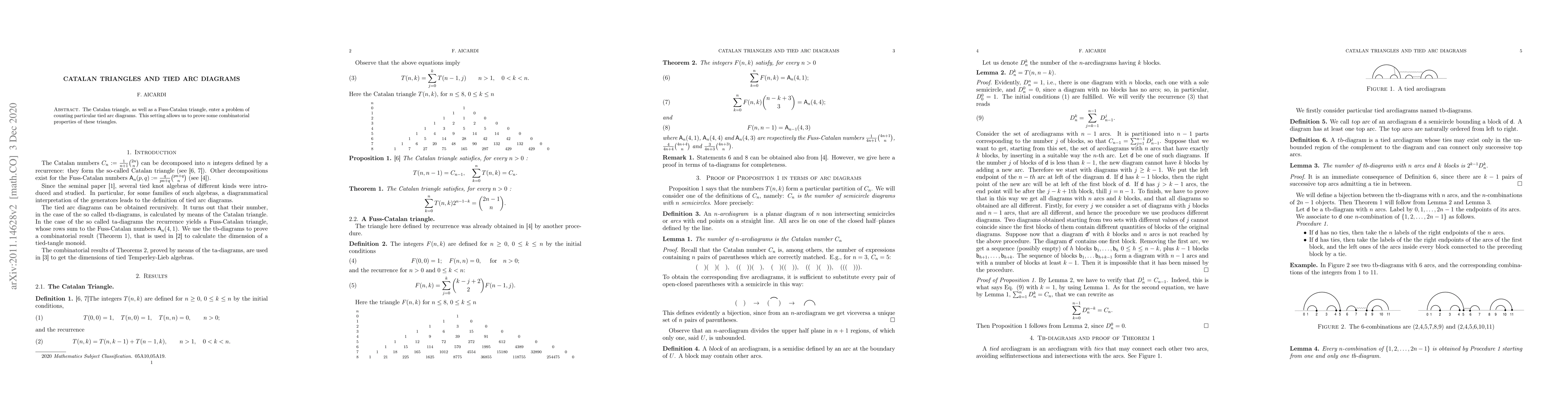 This paper explores the relationship between Catalan triangles and Fuss-Catalan triangles with tied arc diagrams, utilizing this connection to derive combinatorial properties of these mathematical structures.