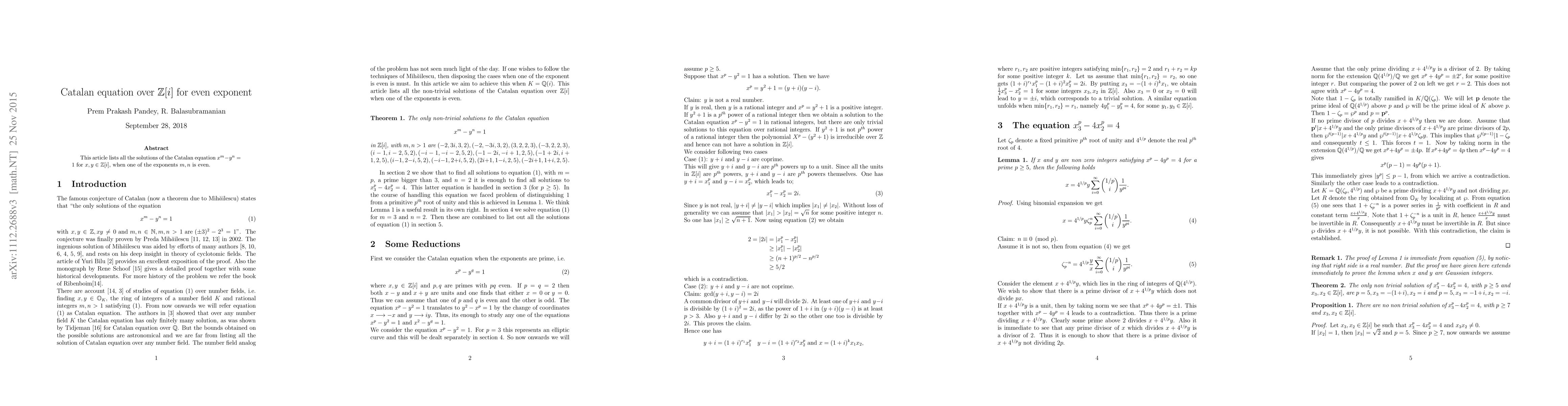 This article lists all the solution of the Catalan equation $x^p-y^q=1$ for $x,y \in \mathbb{Z}[i]$, when one of the primes $p and q$ is even.