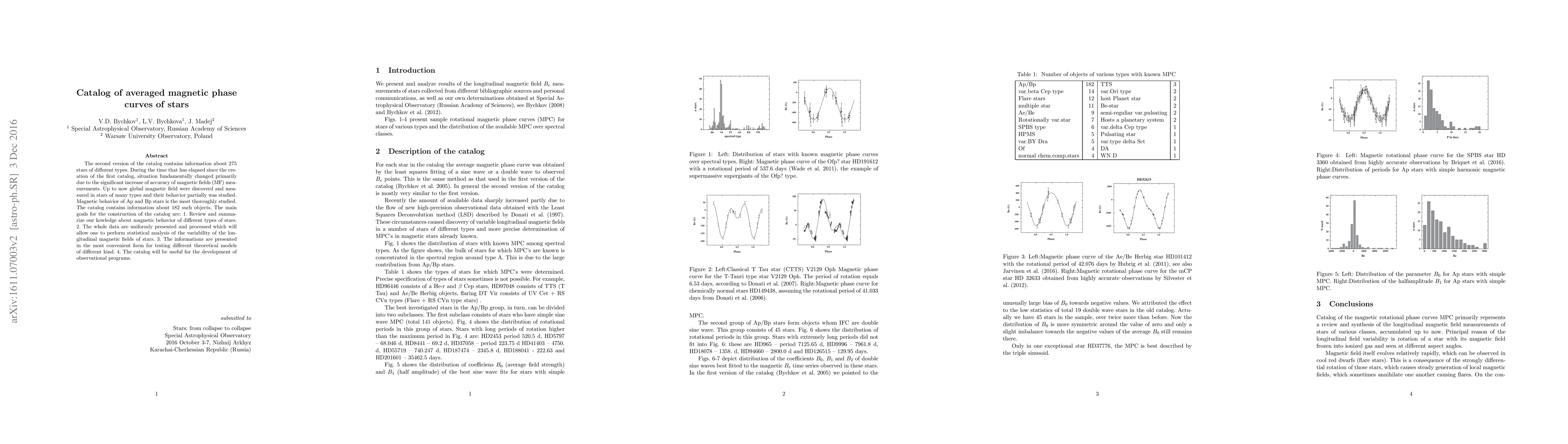 The second version of the catalog contains information about 275 stars of different types. During the time that has elapsed since the creation of the first catalog, situation fundamentally changed primarily due to the significant increase of accuracy of magnetic fields (MF) measurements. Up to now global magnetic field were discoverd and measured in stars of many types and their behavior partially was studied. Magnetic behavior of Ap Bp stars is the most thoroughly studied. The catalog contains information about 182 such objects. The main goals for the construction of the catalog are: 1. Review and summarize our kowledge about magnetic behavior of different types of stars. 2. The whole data are uniformly presented and processed which will allow one to perform statistical analysis of the variability of the (longitudinal) magnetic fields of stars. 3. The informations are presented in the most convenient form for testing different theoretical models of different kind. 4. The catalog will be useful for the development of observational programs.