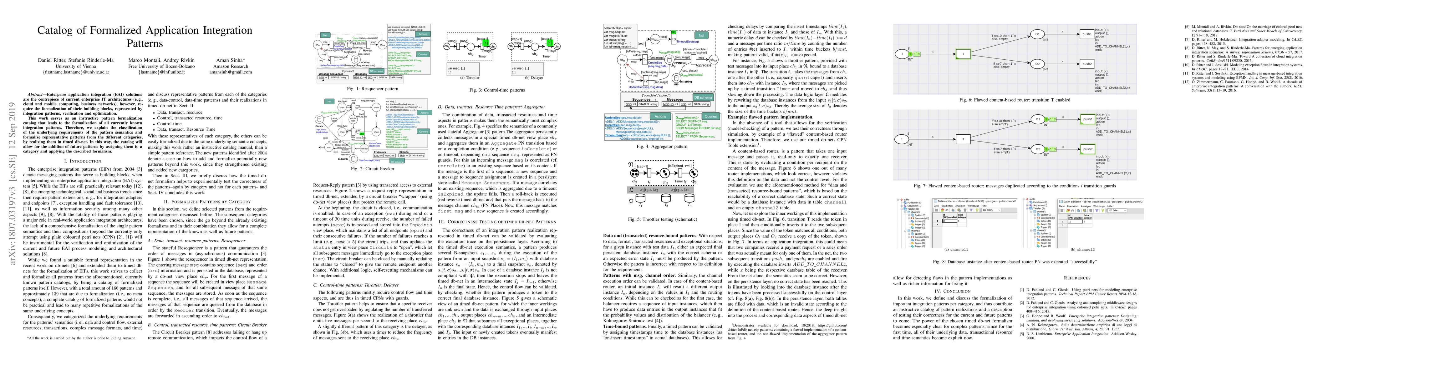 Enterprise application integration (EAI) solutions are the centrepiece of current enterprise IT architectures (e.g., cloud and mobile computing, business networks), however, require the formalization of their building blocks, represented by integration patterns, verification and optimization. This work serves as an instructive pattern formalization catalog that leads to the formalization of all currently known integration patterns. Therefore, we explain the classification of the underlying requirements of the pattern semantics and formalize representative patterns from the different categories, by realizing them in timed db-net. In this way, the catalog will allow for the addition of future patterns by assigning them to a category and applying the described formalism.