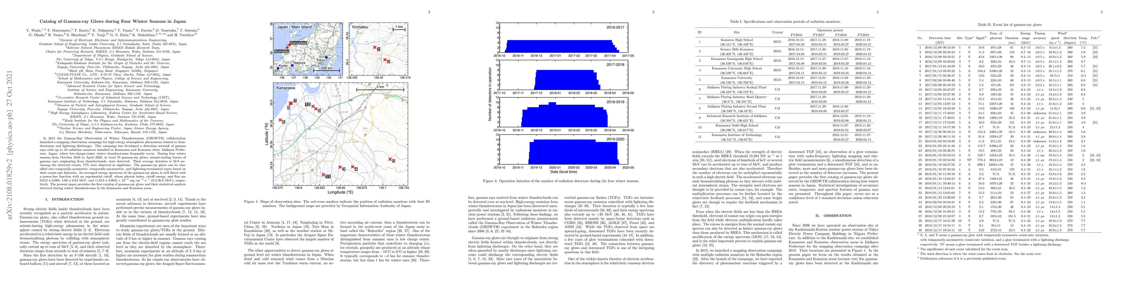 In 2015 the Gamma-Ray Observation of Winter Thunderstorms (GROWTH) collaboration launched a mapping observation campaign for high-energy atmospheric phenomena related to thunderstorms and lightning discharges. This campaign has developed a detection network of gamma rays with up to 10 radiation monitors installed in Kanazawa and Komatsu cities, Ishikawa Prefecture, Japan, where low-charge-center winter thunderstorms frequently occur. During four winter seasons from October 2016 to April 2020, in total 70 gamma-ray glows, minute-lasting bursts of gamma rays originating from thunderclouds, were detected. Their average duration is 58.9 sec. Among the detected events, 77% were observed in nighttime. The gamma-ray glows can be classified into temporally-symmetric, temporally-asymmetric, and lightning-terminated types based on their count-rate histories. An averaged energy spectrum of the gamma-ray glows is well fitted with a power-law function with an exponential cutoff, whose photon index, cutoff energy, and flux are $0.613\pm0.009$, $4.68\pm0.04$ MeV, and $(1.013\pm0.003)\times10^{-5}$ erg cm$^{-2}$ s$^{-1}$ (0.2-20.0MeV), respectively. The present paper provides the first catalog of gamma-ray glows and their statistical analysis detected during winter thunderstorms in the Kanazawa and Komatsu areas.