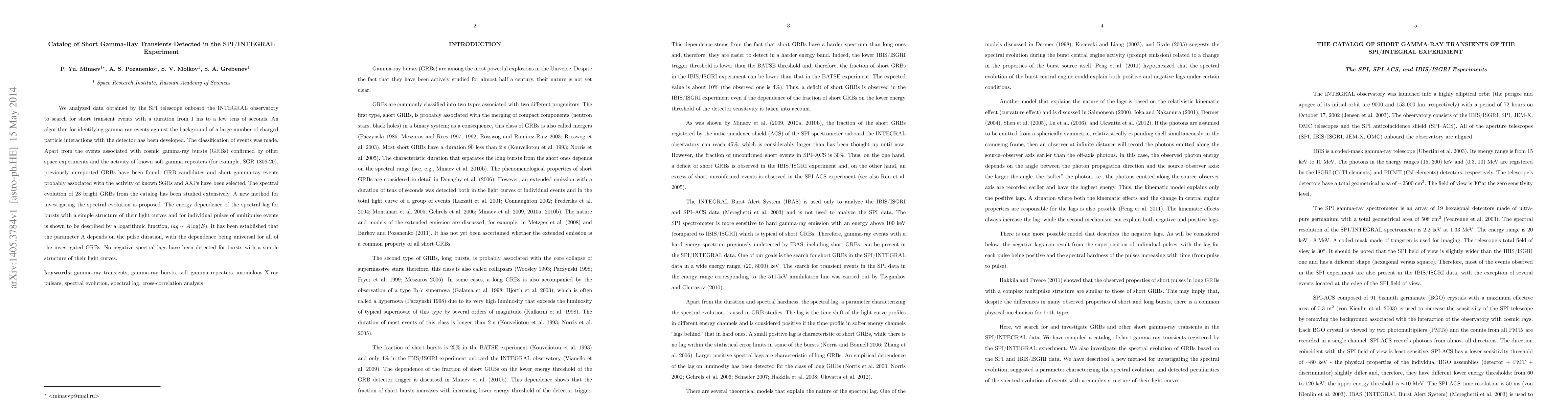 We analyzed data obtained by the SPI telescope onboard the INTEGRAL observatory to search for short transient events with a duration from 1 ms to a few tens of seconds. An algorithm for identifying gamma-ray events against the background of a large number of charged particle interactions with the detector has been developed. The classification of events was made. Apart from the events associated with cosmic gamma-ray bursts (GRBs) confirmed by other space experiments and the activity of known soft gamma repeaters (for example, SGR 1806-20), previously unreported GRBs have been found. GRB candidates and short gamma-ray events probably associated with the activity of known SGRs and AXPs have been selected. The spectral evolution of 28 bright GRBs from the catalog has been studied extensively. A new method for investigating the spectral evolution is proposed. The energy dependence of the spectral lag for bursts with a simple structure of their light curves and for individual pulses of multipulse events is shown to be described by a logarithmic function, lag ~ A*log(E). It has been established that the parameter A depends on the pulse duration, with the dependence being universal for all of the investigated GRBs. No negative spectral lags have been detected for bursts with a simple structure of their light curves.