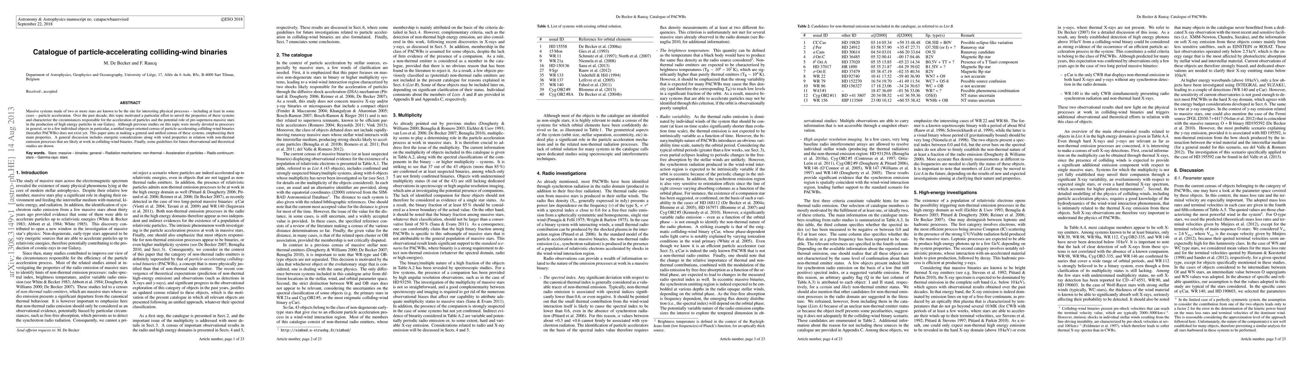 This paper compiles a comprehensive catalog of particle-accelerating colliding-wind binaries (PACWBs), detailing their properties and the mechanisms behind particle acceleration in massive star systems. It also outlines future research directions and theoretical considerations for these high-energy astrophysical phenomena.