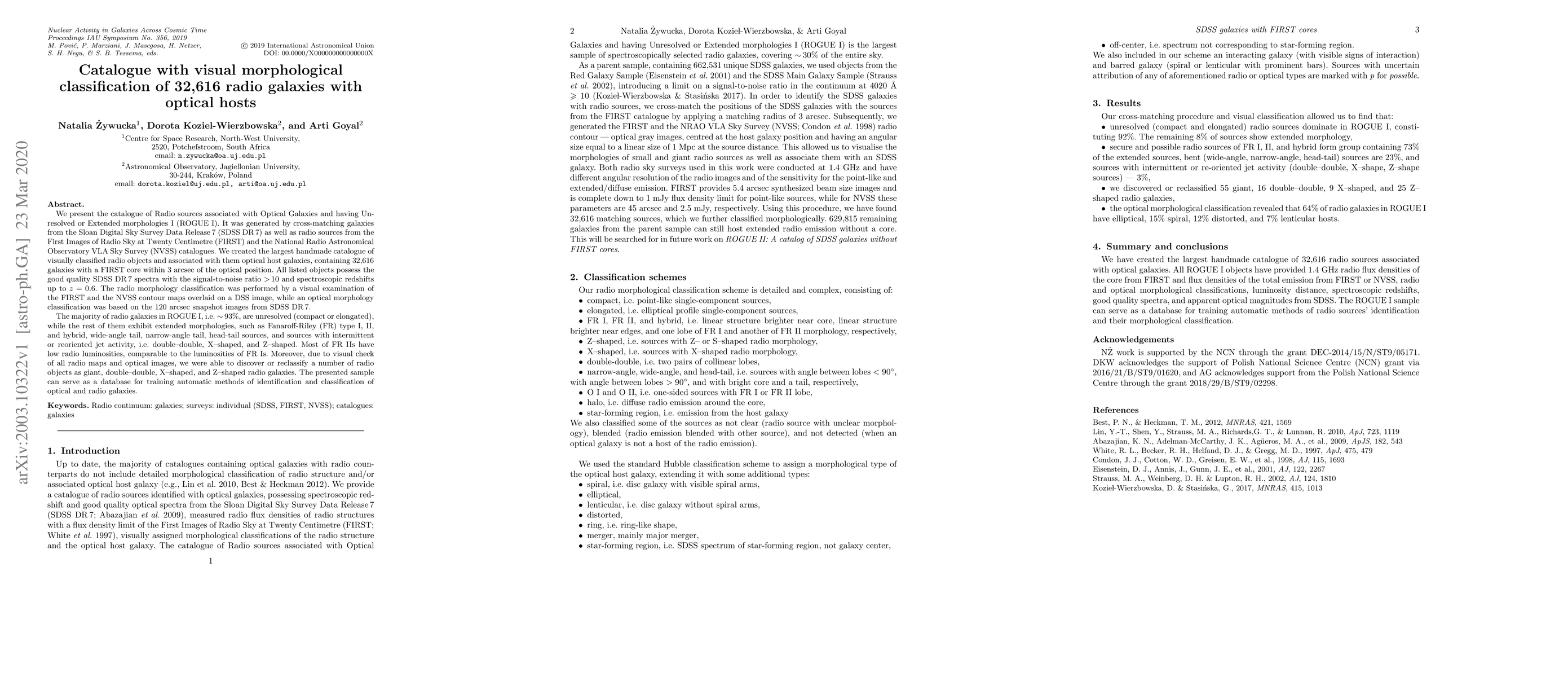 This paper presents the ROGUE I catalogue, a comprehensive visual morphological classification of 32,616 radio galaxies associated with optical hosts from SDSS DR 7 and radio sources from FIRST and NVSS. The catalogue includes detailed radio and optical morphology classifications, revealing that most radio galaxies are unresolved, while a minority exhibit extended morphologies.