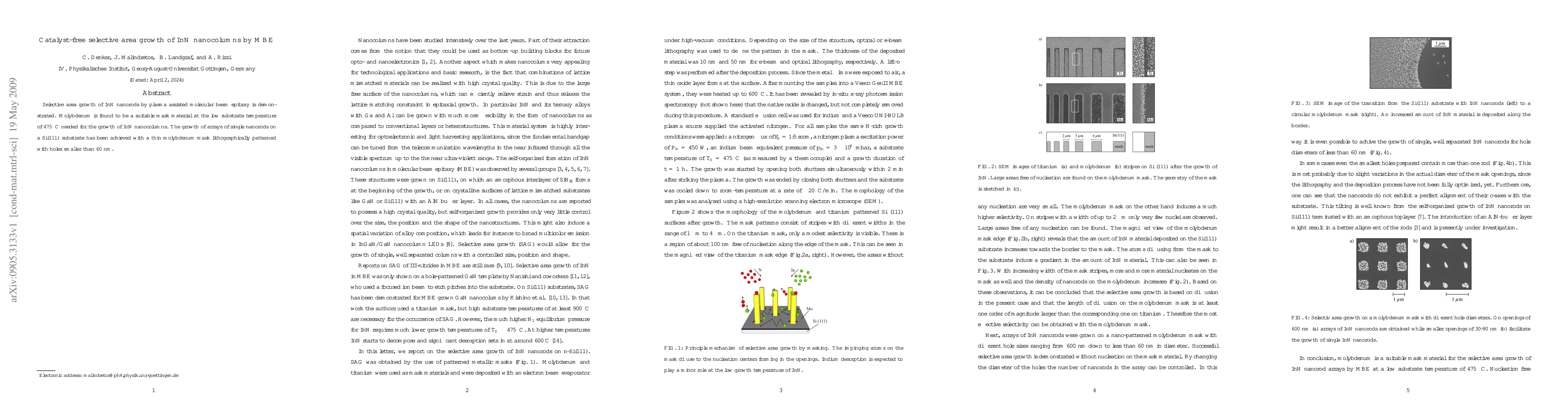 This study demonstrates catalyst-free selective growth of InN nanocolumns using plasma-assisted molecular beam epitaxy (MBE) with molybdenum as an effective mask material at 475°C, achieving arrays of single nanorods on Si(111) substrates.