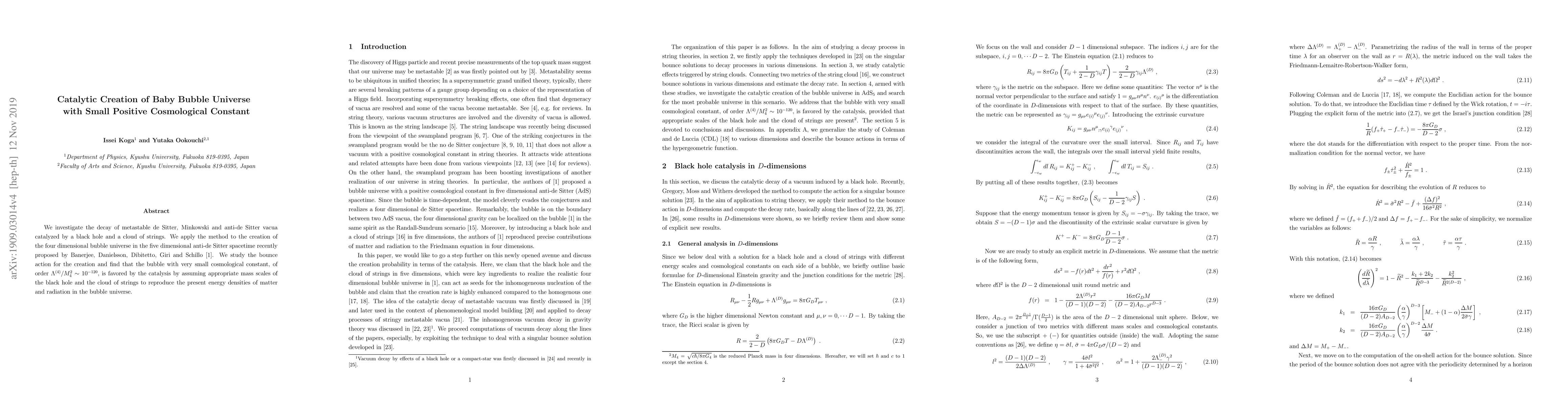This research explores the catalytic decay of different vacua by black holes and string clouds, focusing on the creation of a four-dimensional bubble universe in five-dimensional anti-de Sitter space. The study finds that a bubble universe with an extremely small cosmological constant is favored, assuming specific mass scales for the catalysts to match observed energy densities.