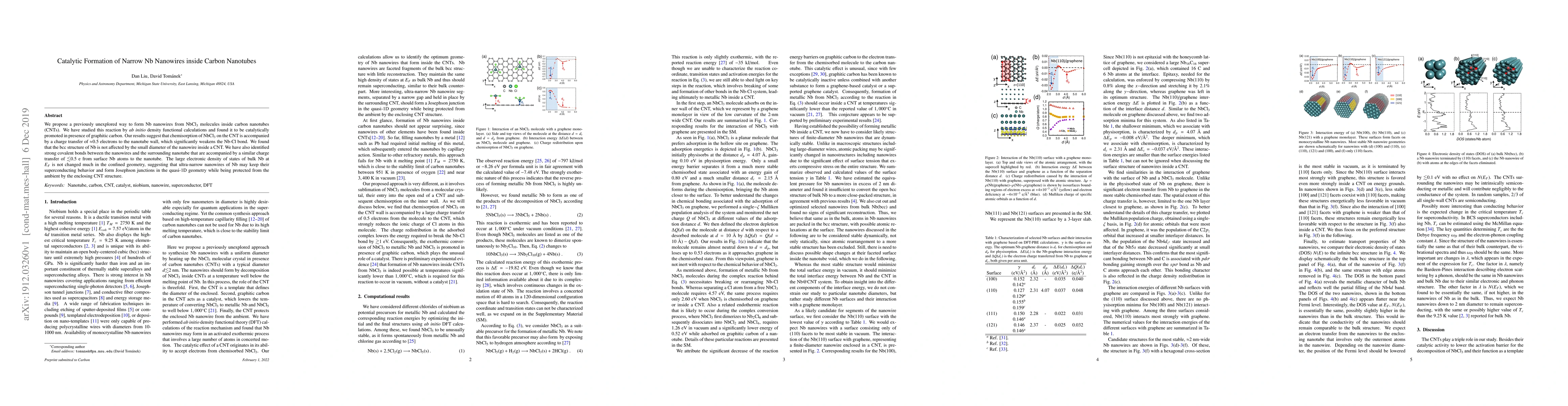 Researchers discovered a way to form ultra-narrow niobium nanowires inside carbon nanotubes through a catalytic reaction, preserving the superconducting behavior of niobium. The process involves chemisorption on graphitic carbon, weakening the niobium-chlorine bond and forming strong covalent bonds between the nanowire and the nanotube.