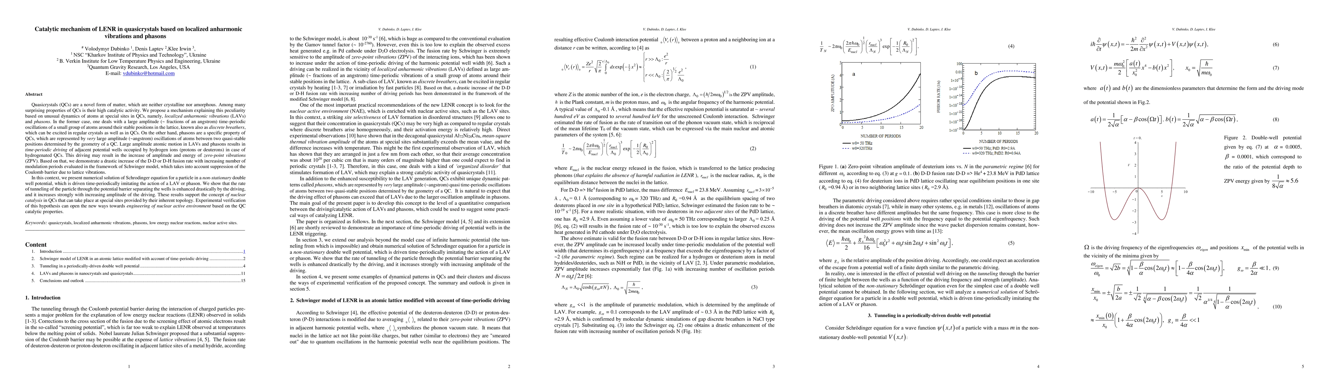 Quasicrystals (QCs) are a novel form of matter, which are neither crystalline nor amorphous. Among many surprising properties of QCs is their high catalytic activity. We propose a mechanism explaining this peculiarity based on unusual dynamics of atoms at special sites in QCs, namely, localized anharmonic vibrations (LAVs) and phasons. In the former case, one deals with a large amplitude (~ fractions of an angstrom) time-periodic oscillations of a small group of atoms around their stable positions in the lattice, known also as discrete breathers, which can be excited in regular crystals as well as in QCs. On the other hand, phasons are a specific property of QCs, which are represented by very large amplitude (~angstrom) oscillations of atoms be-tween two quasi-stable positions determined by the geometry of a QC. Large amplitude atomic motion in LAVs and phasons results in time-periodic driving of adjacent potential wells occupied by hydrogen ions (protons or deuterons) in case of hydrogenated QCs. This driving may result in the increase of amplitude and energy of zero-point vibrations (ZPV). Based on that, we demonstrate a drastic increase of the D-D or D-H fusion rate with increasing number of modulation periods evaluated in the framework of Schwinger model, which takes into account suppression of the Coulomb barrier due to lattice vibrations. In this context, we present numerical solution of Schrodinger equation for a particle in a non-stationary double well potential, which is driven time-periodically imitating the action of a LAV or phason. We show that the rate of tunneling of the particle through the potential barrier separating the wells is enhanced drastically by the driving, and it increases strongly with increasing amplitude of the driving. These results support the concept of nuclear catalysis in QCs that can take place at special sites provided by their inherent topology.