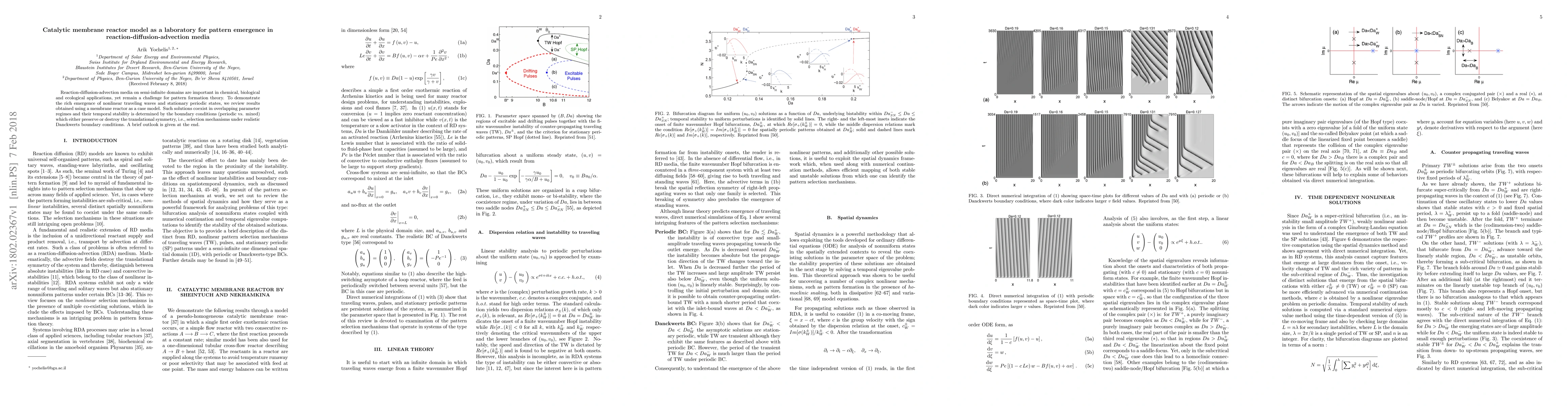 This paper explores the use of a catalytic membrane reactor model to study pattern emergence in reaction-diffusion-advection systems. It highlights the coexistence of nonlinear traveling waves and stationary periodic states under different boundary conditions, emphasizing the role of these conditions in determining temporal stability and selection mechanisms.
