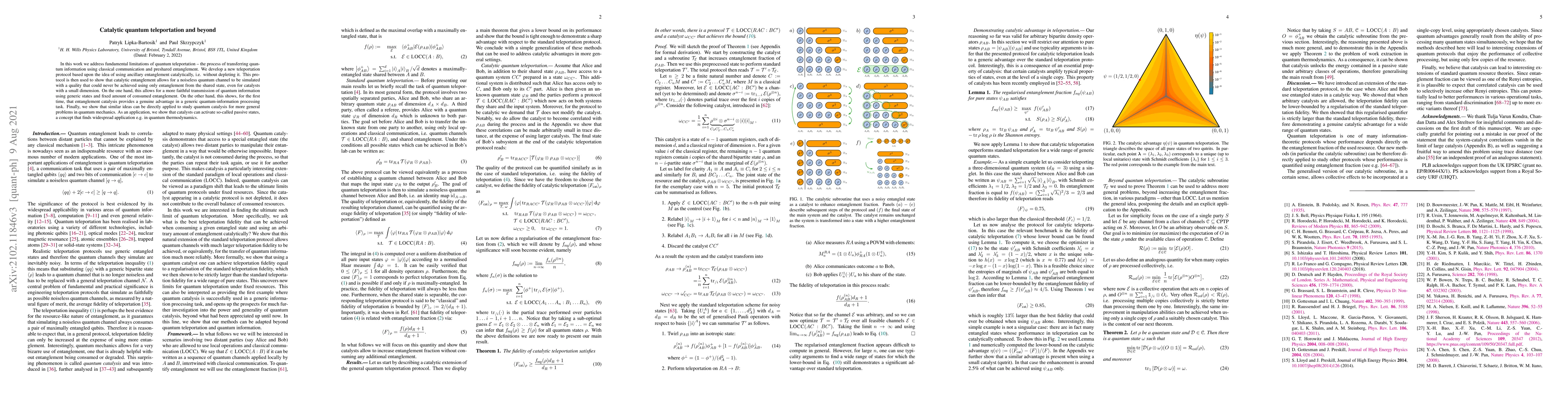 We address fundamental limitations of quantum teleportation -- the process of transferring quantum information using classical communication and preshared entanglement. We develop a new teleportation protocol based upon the idea of using ancillary entanglement catalytically, i.e. without depleting it. This protocol is then used to show that catalytic entanglement allows for a noiseless quantum channel to be simulated with a quality that could never be achieved using only entanglement from the shared state, even for catalysts with a small dimension. On the one hand, this allows for a more faithful transmission of quantum information using generic states and a fixed amount of consumed entanglement. On the other hand, this shows, for the first time, that entanglement catalysis provides a genuine advantage in a generic quantum-information processing task. Finally, we show that similar ideas can be directly applied to study quantum catalysis for more general problems in quantum mechanics. As an application, we show that catalysts can activate so-called passive states, a concept that finds widespread application e.g. in quantum thermodynamics.