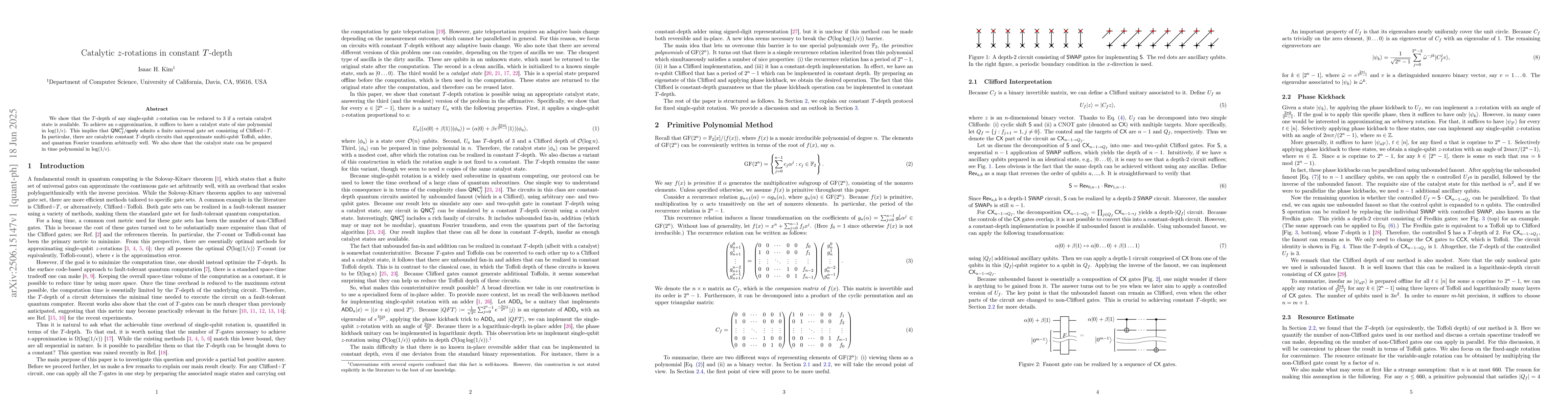 We show that the $T$-depth of any single-qubit $z$-rotation can be reduced to $3$ if a certain catalyst state is available. To achieve an $\epsilon$-approximation, it suffices to have a catalyst state of size polynomial in $\log(1/\epsilon)$. This implies that $\mathsf{QNC}^0_f/\mathsf{qpoly}$ admits a finite universal gate set consisting of Clifford+$T$. In particular, there are catalytic constant $T$-depth circuits that approximate multi-qubit Toffoli, adder, and quantum Fourier transform arbitrarily well. We also show that the catalyst state can be prepared in time polynomial in $\log (1/\epsilon)$.