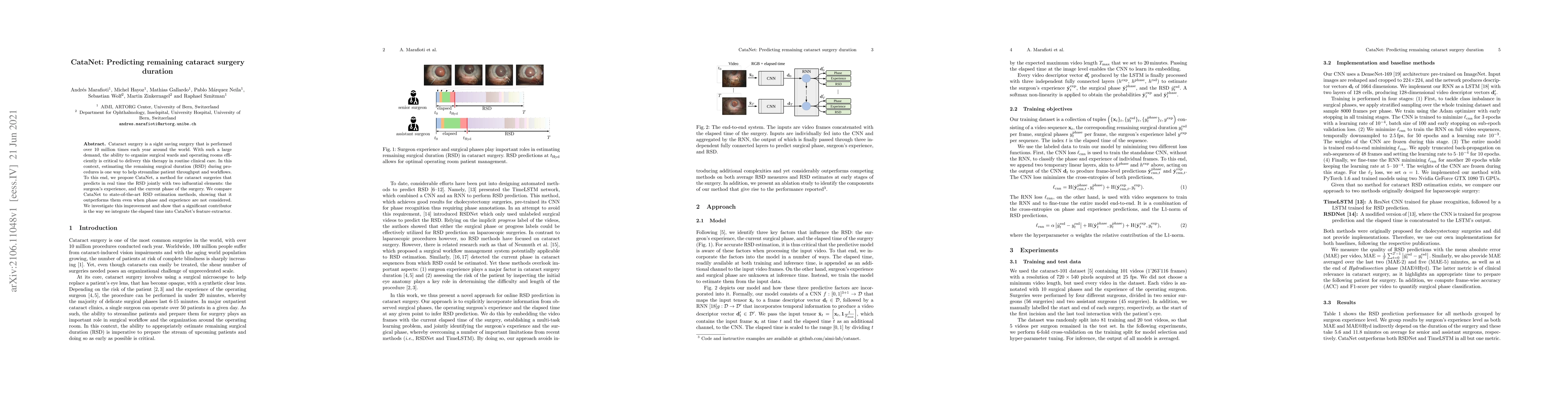 CataNet is a novel method for predicting the remaining duration of cataract surgeries in real time, incorporating surgeon experience and current surgical phase. It outperforms existing methods, largely due to its effective integration of elapsed time into its feature extractor.