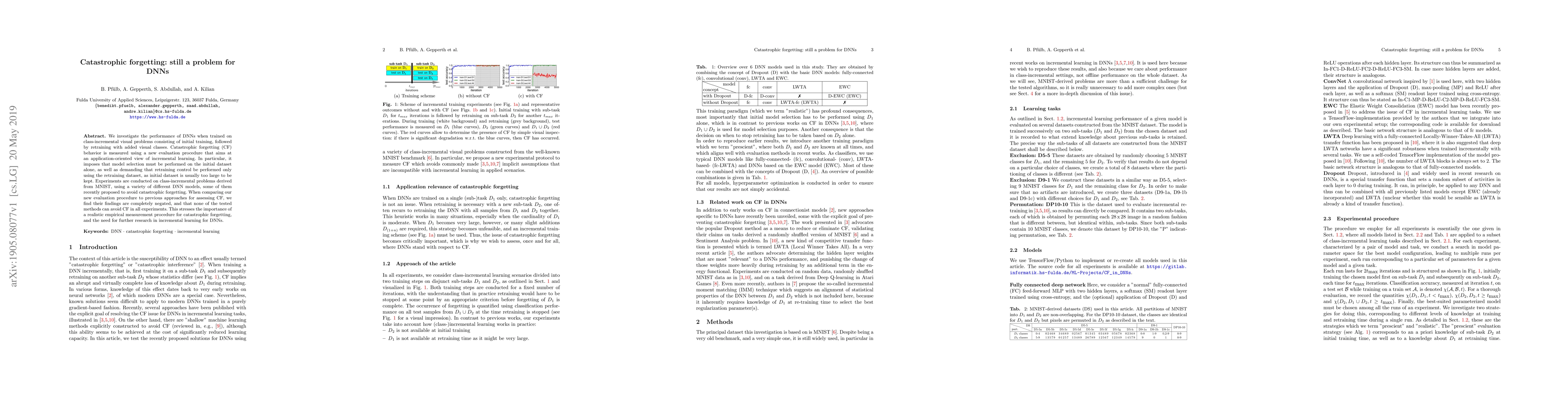We investigate the performance of DNNs when trained on class-incremental visual problems consisting of initial training, followed by retraining with added visual classes. Catastrophic forgetting (CF) behavior is measured using a new evaluation procedure that aims at an application-oriented view of incremental learning. In particular, it imposes that model selection must be performed on the initial dataset alone, as well as demanding that retraining control be performed only using the retraining dataset, as initial dataset is usually too large to be kept. Experiments are conducted on class-incremental problems derived from MNIST, using a variety of different DNN models, some of them recently proposed to avoid catastrophic forgetting. When comparing our new evaluation procedure to previous approaches for assessing CF, we find their findings are completely negated, and that none of the tested methods can avoid CF in all experiments. This stresses the importance of a realistic empirical measurement procedure for catastrophic forgetting, and the need for further research in incremental learning for DNNs.