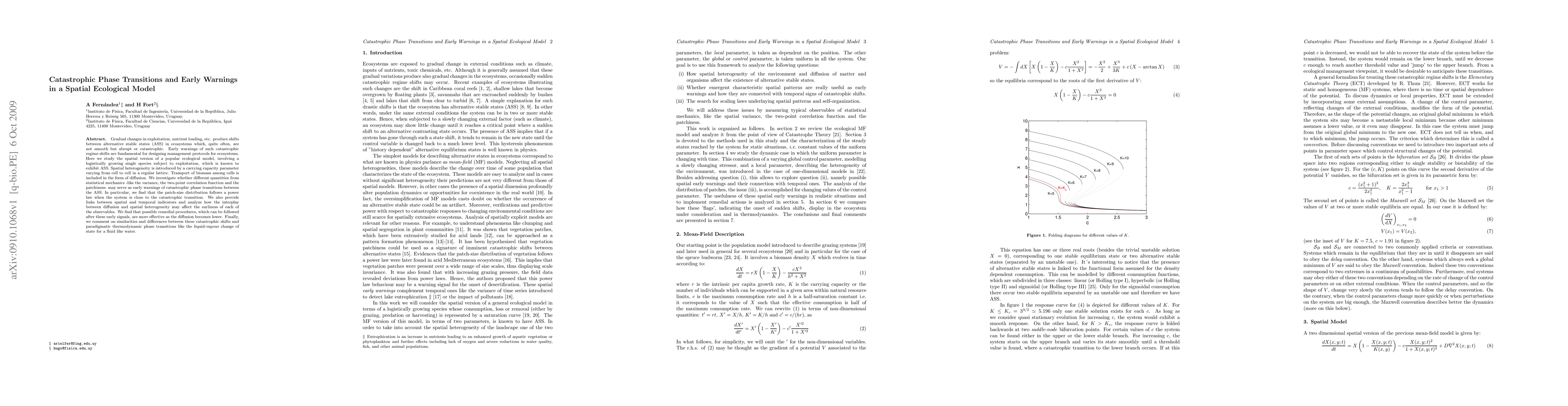 Gradual changes in exploitation, nutrient loading, etc. produce shifts between alternative stable states (ASS) in ecosystems which, quite often, are not smooth but abrupt or catastrophic. Early warnings of such catastrophic regime shifts are fundamental for designing management protocols for ecosystems. Here we study the spatial version of a popular ecological model, involving a logistically growing single species subject to exploitation, which is known to exhibit ASS. Spatial heterogeneity is introduced by a carrying capacity parameter varying from cell to cell in a regular lattice. Transport of biomass among cells is included in the form of diffusion. We investigate whether different quantities from statistical mechanics -like the variance, the two-point correlation function and the patchiness- may serve as early warnings of catastrophic phase transitions between the ASS. In particular, we find that the patch-size distribution follows a power law when the system is close to the catastrophic transition. We also provide links between spatial and temporal indicators and analyze how the interplay between diffusion and spatial heterogeneity may affect the earliness of each of the observables. We find that possible remedial procedures, which can be followed after these early signals, are more effective as the diffusion becomes lower. Finally, we comment on similarities and differences between these catastrophic shifts and paradigmatic thermodynamic phase transitions like the liquid-vapour change of state for a fluid like water.