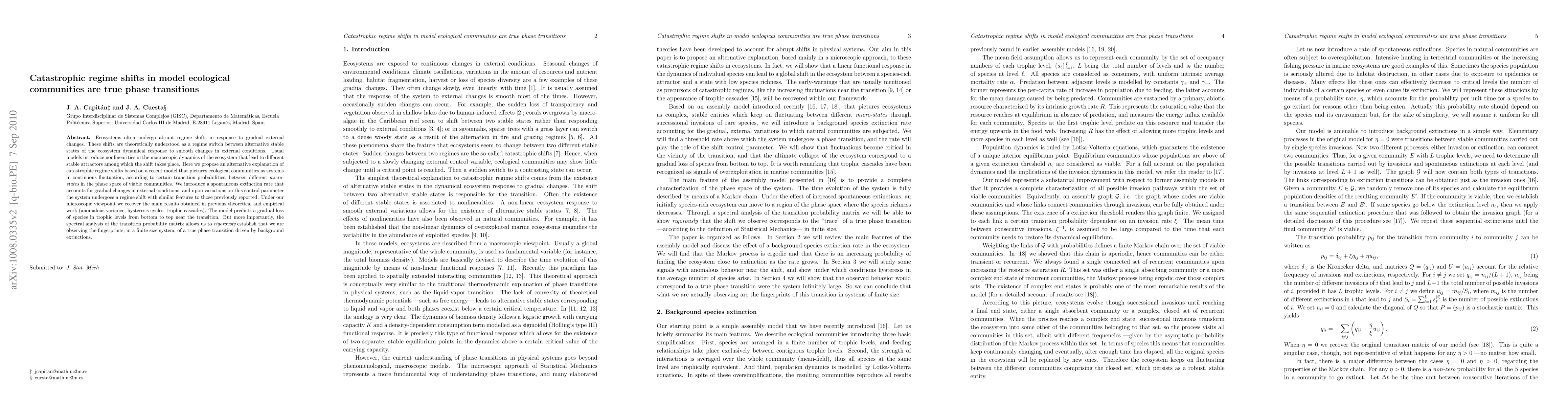 This paper proposes a new model explaining catastrophic regime shifts in ecological communities as true phase transitions, driven by background extinctions, and demonstrates that these shifts exhibit characteristics like anomalous variance and hysteresis, akin to previous findings. The model's spectral analysis confirms the presence of a phase transition in finite systems.