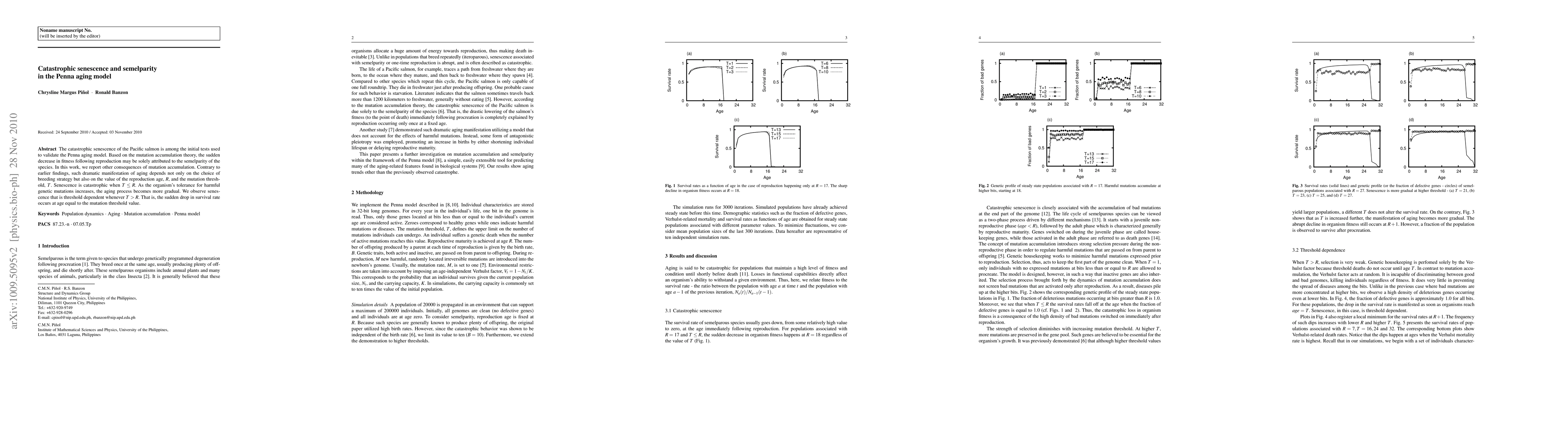 The Penna aging model validates catastrophic senescence in Pacific salmon, attributing it to semelparity and mutation accumulation. However, senescence's dramatic nature depends on both breeding strategy and the interplay between reproduction age and mutation threshold, becoming more gradual as the organism's tolerance for mutations increases.