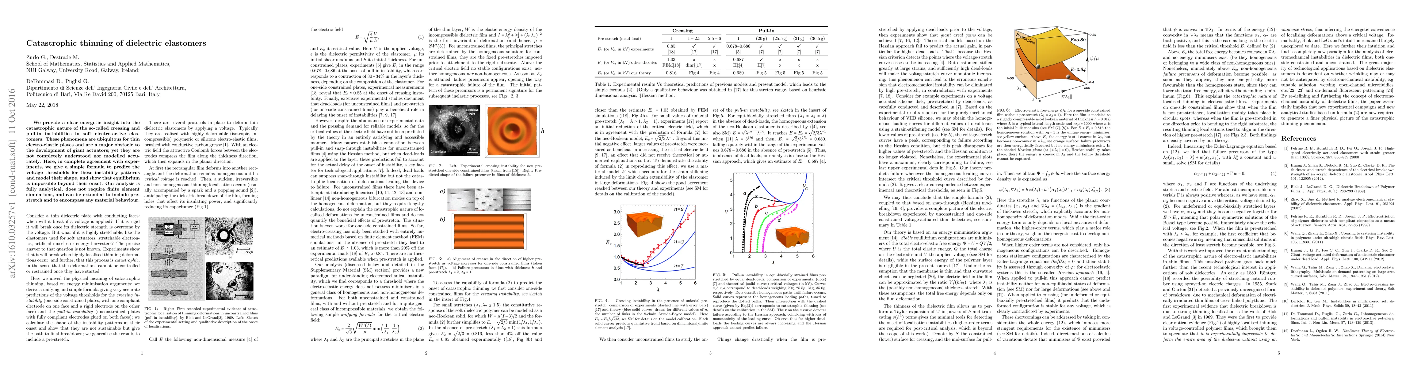 This paper presents an analytical model to predict voltage thresholds for creasing and pull-in instabilities in dielectric elastomers, demonstrating the catastrophic nature of these phenomena. The authors provide a simple formula in agreement with experimental data, highlighting the impossibility of equilibrium beyond the onset of these instabilities.