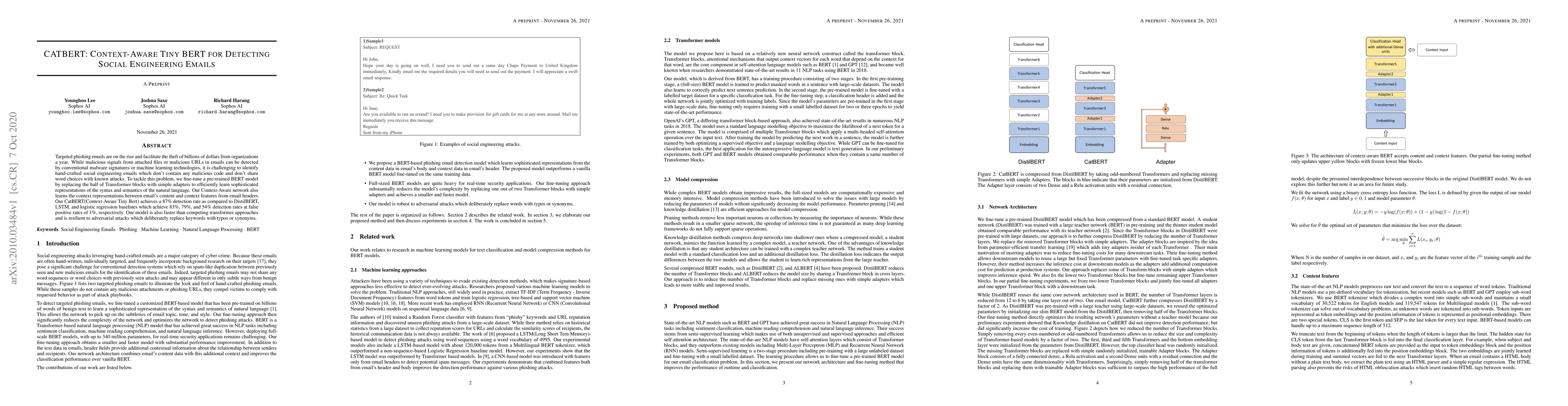 Targeted phishing emails are on the rise and facilitate the theft of billions of dollars from organizations a year. While malicious signals from attached files or malicious URLs in emails can be detected by conventional malware signatures or machine learning technologies, it is challenging to identify hand-crafted social engineering emails which don't contain any malicious code and don't share word choices with known attacks. To tackle this problem, we fine-tune a pre-trained BERT model by replacing the half of Transformer blocks with simple adapters to efficiently learn sophisticated representations of the syntax and semantics of the natural language. Our Context-Aware network also learns the context representations between email's content and context features from email headers. Our CatBERT(Context-Aware Tiny Bert) achieves a 87% detection rate as compared to DistilBERT, LSTM, and logistic regression baselines which achieve 83%, 79%, and 54% detection rates at false positive rates of 1%, respectively. Our model is also faster than competing transformer approaches and is resilient to adversarial attacks which deliberately replace keywords with typos or synonyms.