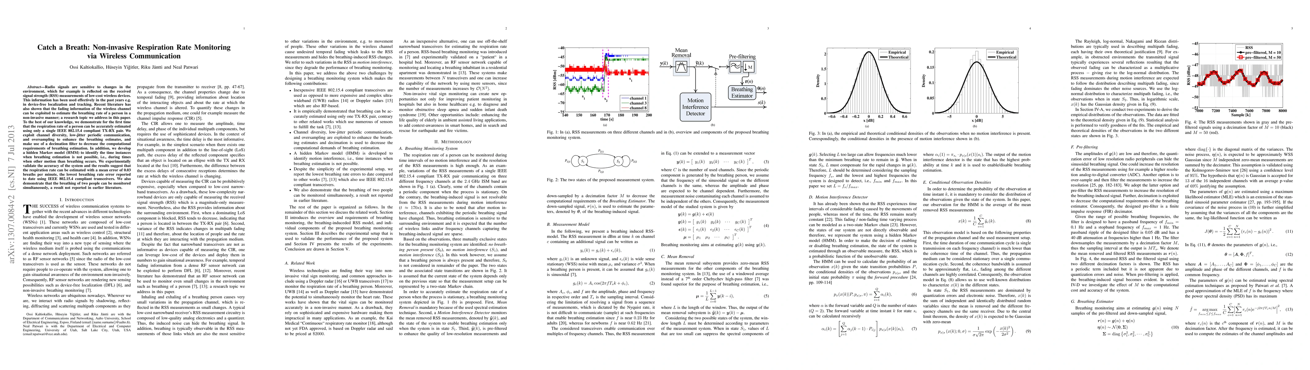 Radio signals are sensitive to changes in the environment, which for example is reflected on the received signal strength (RSS) measurements of low-cost wireless devices. This information has been used effectively in the past years e.g. in device-free localization and tracking. Recent literature has also shown that the fading information of the wireless channel can be exploited to estimate the breathing rate of a person in a non-invasive manner; a research topic we address in this paper. To the best of our knowledge, we demonstrate for the first time that the respiration rate of a person can be accurately estimated using only a single IEEE 802.15.4 compliant TX-RX pair. We exploit channel diversity, low-jitter periodic communication, and oversampling to enhance the breathing estimates, and make use of a decimation filter to decrease the computational requirements of breathing estimation. In addition, we develop a hidden Markov model (HMM) to identify the time instances when breathing estimation is not possible, i.e., during times when other motion than breathing occurs. We experimentally validate the accuracy of the system and the results suggest that the respiration rate can be estimated with a mean error of 0.03 breaths per minute, the lowest breathing rate error reported to date using IEEE 802.15.4 compliant transceivers. We also demonstrate that the breathing of two people can be monitored simultaneously, a result not reported in earlier literature.
