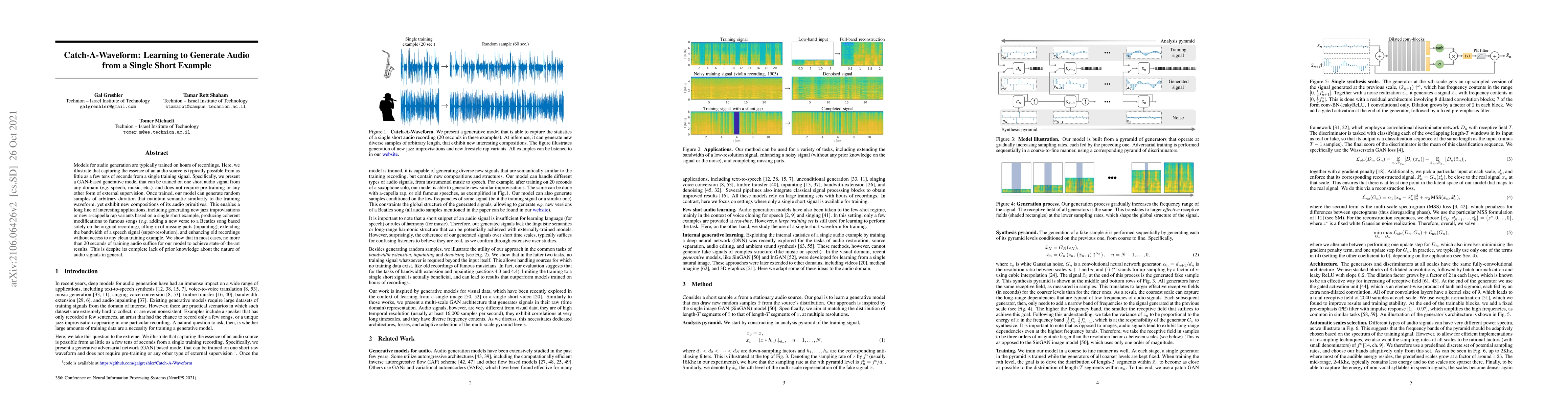 Models for audio generation are typically trained on hours of recordings. Here, we illustrate that capturing the essence of an audio source is typically possible from as little as a few tens of seconds from a single training signal. Specifically, we present a GAN-based generative model that can be trained on one short audio signal from any domain (e.g. speech, music, etc.) and does not require pre-training or any other form of external supervision. Once trained, our model can generate random samples of arbitrary duration that maintain semantic similarity to the training waveform, yet exhibit new compositions of its audio primitives. This enables a long line of interesting applications, including generating new jazz improvisations or new a-cappella rap variants based on a single short example, producing coherent modifications to famous songs (e.g. adding a new verse to a Beatles song based solely on the original recording), filling-in of missing parts (inpainting), extending the bandwidth of a speech signal (super-resolution), and enhancing old recordings without access to any clean training example. We show that in all cases, no more than 20 seconds of training audio commonly suffice for our model to achieve state-of-the-art results. This is despite its complete lack of prior knowledge about the nature of audio signals in general.