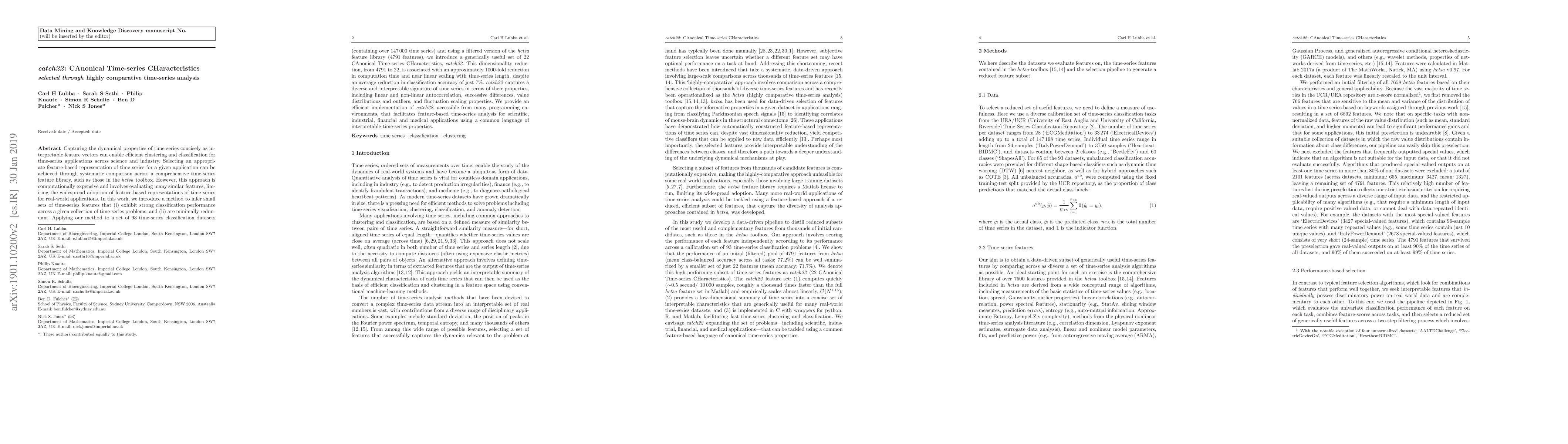 Capturing the dynamical properties of time series concisely as interpretable feature vectors can enable efficient clustering and classification for time-series applications across science and industry. Selecting an appropriate feature-based representation of time series for a given application can be achieved through systematic comparison across a comprehensive time-series feature library, such as those in the hctsa toolbox. However, this approach is computationally expensive and involves evaluating many similar features, limiting the widespread adoption of feature-based representations of time series for real-world applications. In this work, we introduce a method to infer small sets of time-series features that (i) exhibit strong classification performance across a given collection of time-series problems, and (ii) are minimally redundant. Applying our method to a set of 93 time-series classification datasets (containing over 147000 time series) and using a filtered version of the hctsa feature library (4791 features), we introduce a generically useful set of 22 CAnonical Time-series CHaracteristics, catch22. This dimensionality reduction, from 4791 to 22, is associated with an approximately 1000-fold reduction in computation time and near linear scaling with time-series length, despite an average reduction in classification accuracy of just 7%. catch22 captures a diverse and interpretable signature of time series in terms of their properties, including linear and non-linear autocorrelation, successive differences, value distributions and outliers, and fluctuation scaling properties. We provide an efficient implementation of catch22, accessible from many programming environments, that facilitates feature-based time-series analysis for scientific, industrial, financial and medical applications using a common language of interpretable time-series properties.