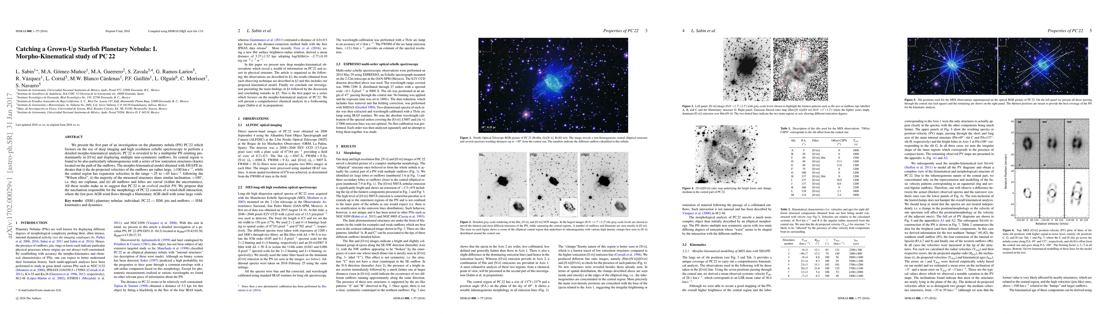 We present the first part of an investigation on the planetary nebula (PN) PC 22 which focuses on the use of deep imaging and high resolution echelle spectroscopy to perform a detailed morpho-kinematical analysis. PC 22 is revealed to be a multipolar PN emitting predominantly in [O III] and displaying multiple non-symmetric outflows. Its central region is found to be also particularly inhomogeneous with a series of low ionization structures (knots) located on the path of the outflows. The morpho-kinematical model obtained with SHAPE indicates that i) the de-projected velocities of the outflows are rather large, > 100 km/s, while the central region has expansion velocities in the range ~25 to ~45 km/s following the "Wilson effect", ii) the majority of the measured structures share similar inclination, ~100 degrees, i.e. they are coplanar, and iii) all outflows and lobes are coeval (within the uncertainties). All these results make us to suggest that PC 22 is an evolved starfish PN. We propose that the mechanism responsible for the morphology of PC 22 consists of a wind-shell interaction, where the fast post-AGB wind flows through a filamentary AGB shell with some large voids.