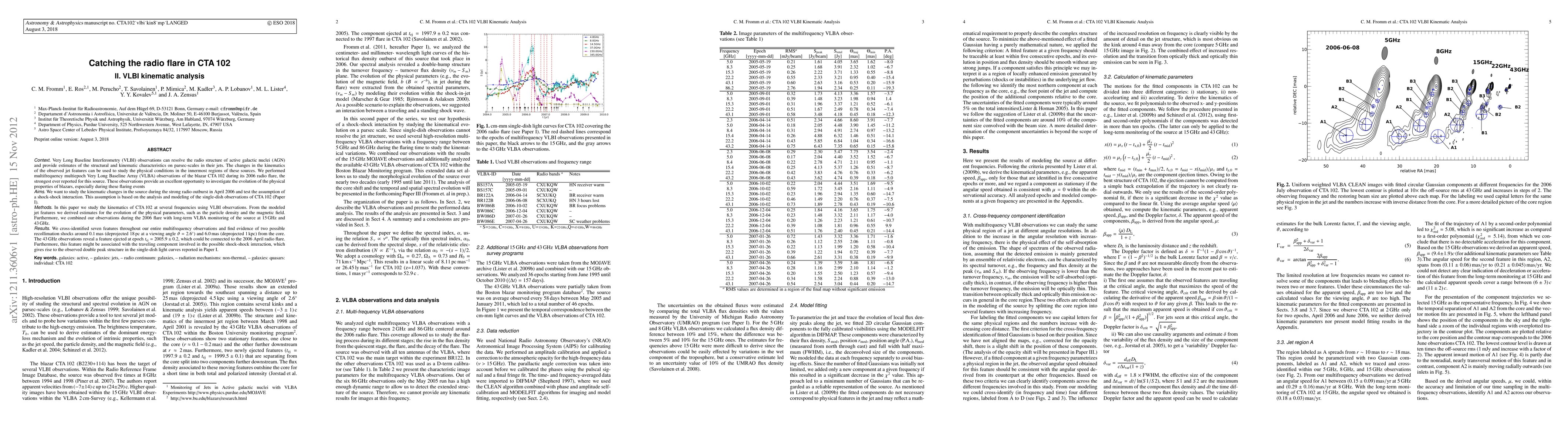 We performed multifrequency multiepoch Very Long Baseline Array (VLBA) observations of the blazar CTA 102 during its 2006 radio flare, the strongest ever reported for this source. These observations provide an excellent opportunity to investigate the evolution of the physical properties of blazars, especially during these flaring events. We want to study the kinematic changes in the source during the strong radio outburst in April 2006 and test the assumption of a shock-shock interaction. This assumption is based on the analysis and modeling of the single-dish observations of CTA\,102 (Paper I). In this paper we study the kinematics of CTA 102 at several frequencies using VLBI observations. From the modeled jet features we derived estimates for the evolution of the physical parameters, such as the particle density and the magnetic field. Furthermore, we combined our observations during the 2006 flare with long-term VLBA monitoring of the source at 15 GHz and 43 GHz. We cross-identified seven features throughout our entire multifrequency observations and find evidence of two possible recollimation shocks around 0.1 mas (deprojected 18 pc at a viewing angle of 2.6 degrees) and 6.0 mas (deprojected 1 kpc) from the core. The 43 GHz observations reveal a feature ejected at epoch $t_\mathrm{ej}=2005.9\pm0.2$, which could be connected to the 2006 April radio flare. Furthermore, this feature might be associated with the traveling component involved in the possible shock-shock interaction, which gives rise to the observed double peak structure in the single-dish light curves reported in Paper I.