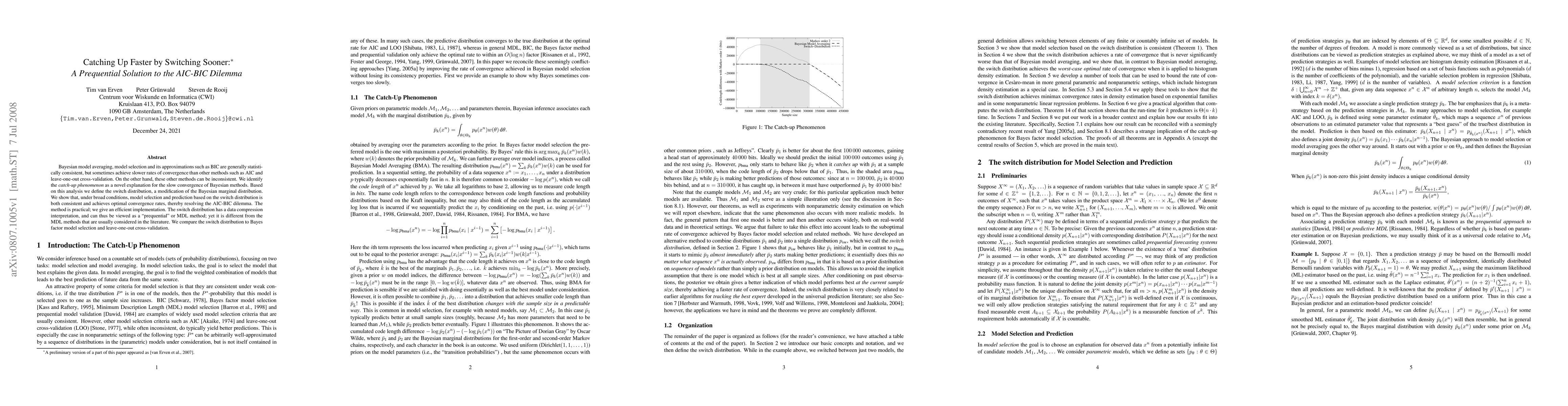 Bayesian model averaging, model selection and its approximations such as BIC are generally statistically consistent, but sometimes achieve slower rates og convergence than other methods such as AIC and leave-one-out cross-validation. On the other hand, these other methods can br inconsistent. We identify the "catch-up phenomenon" as a novel explanation for the slow convergence of Bayesian methods. Based on this analysis we define the switch distribution, a modification of the Bayesian marginal distribution. We show that, under broad conditions,model selection and prediction based on the switch distribution is both consistent and achieves optimal convergence rates, thereby resolving the AIC-BIC dilemma. The method is practical; we give an efficient implementation. The switch distribution has a data compression interpretation, and can thus be viewed as a "prequential" or MDL method; yet it is different from the MDL methods that are usually considered in the literature. We compare the switch distribution to Bayes factor model selection and leave-one-out cross-validation.