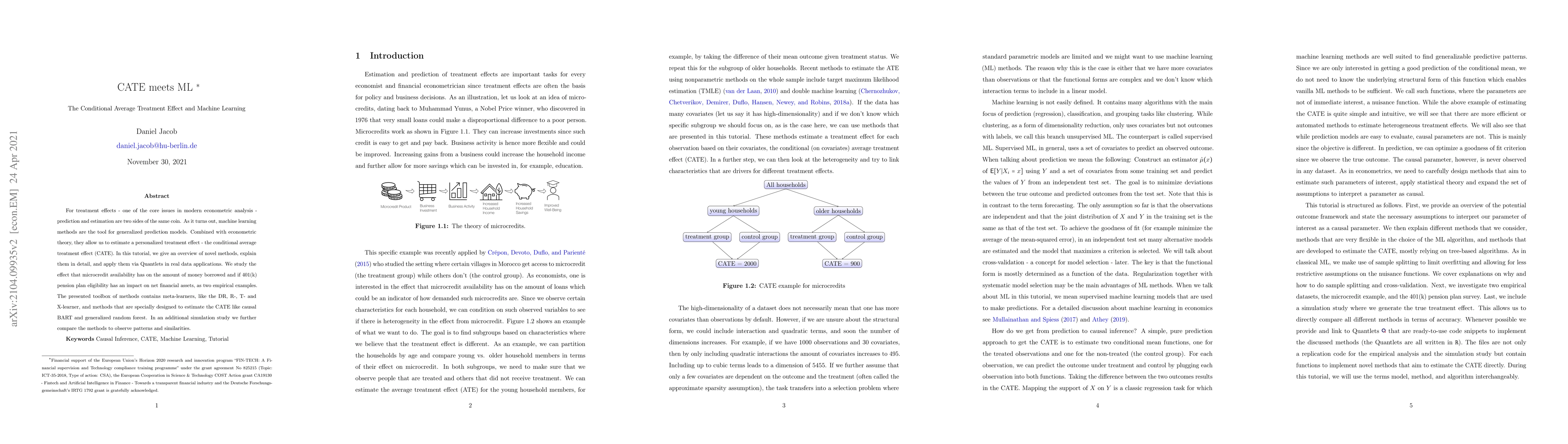 This paper explores the integration of machine learning techniques with econometric theory to estimate the conditional average treatment effect (CATE), demonstrating novel methods through real-world applications like microcredit and 401(k) pension plans. It finds positive treatment effects but mixed evidence on heterogeneity, supported by a simulation study comparing various meta-learners and causal estimation methods.
