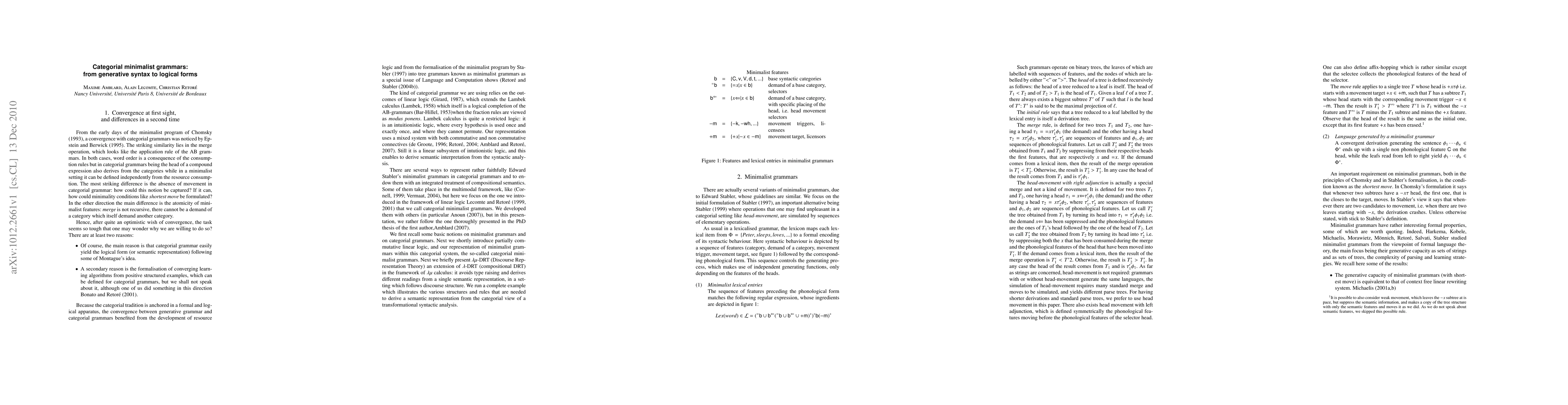This paper introduces categorial minimalist grammars, representing minimalist grammars within a categorial system utilizing partially commutative linear logic. It also presents \lambda\mu-DRT, an extension of \lambda-DRT that derives different readings from a single semantic representation by following discourse structure. An example is provided to illustrate the derivation of a semantic representation from a categorial view of transformational syntax.