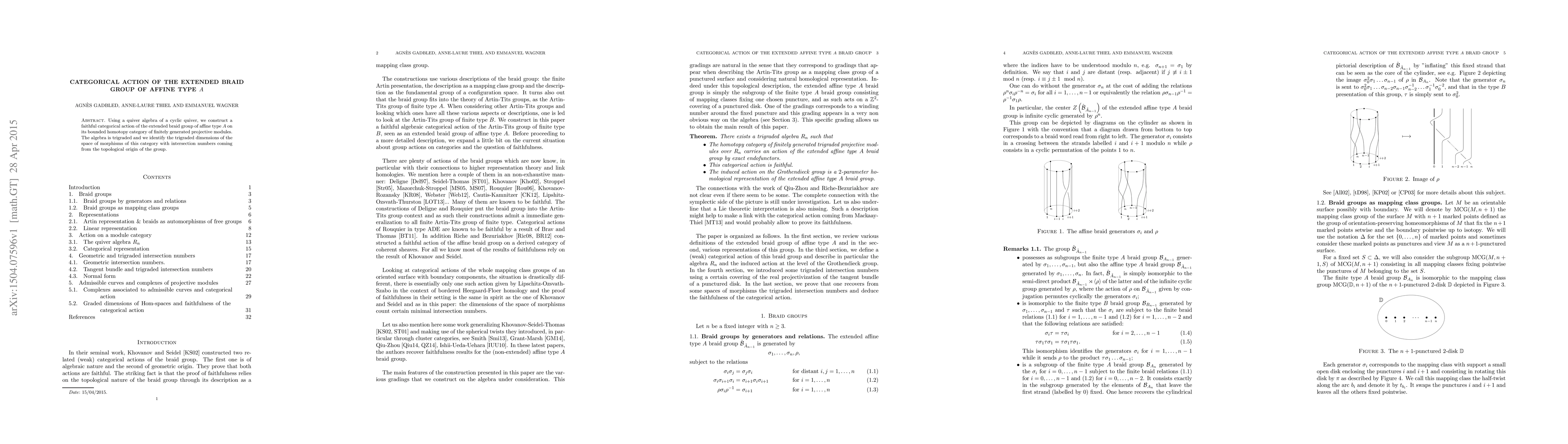 The paper constructs a faithful categorical action of the extended braid group of affine type A on the bounded homotopy category of projective modules via a trigraded quiver algebra, identifying trigraded dimensions with intersection numbers from the group's topological origin.
