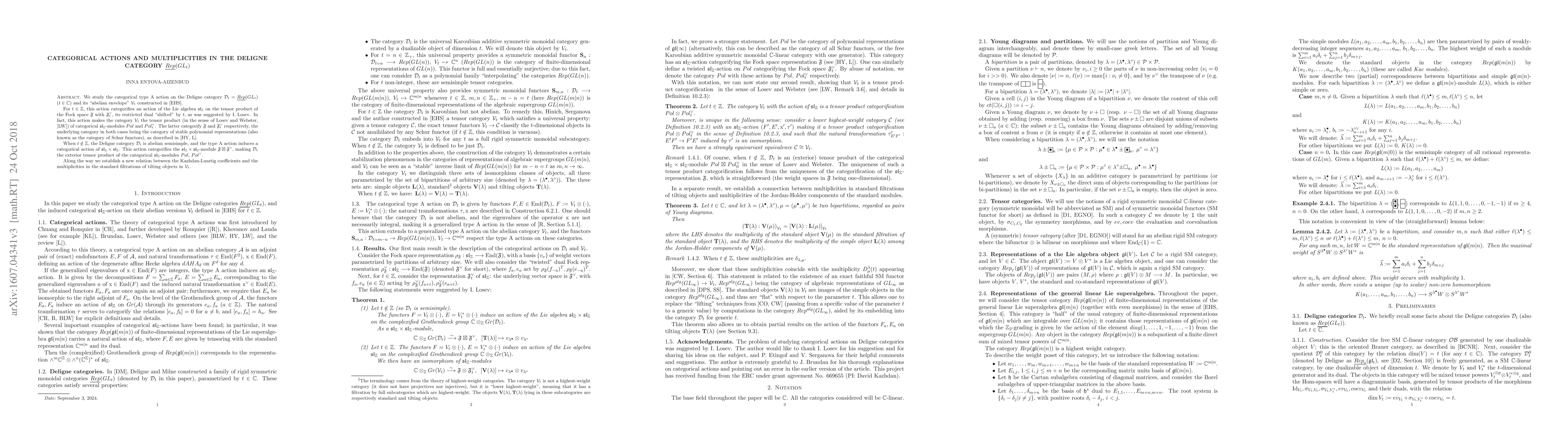 We study the categorical type A action on the Deligne category $\mathcal{D}_t=\underline{Rep}(GL_t)$ (here $t \in \mathbb{C}$) and its "abelian envelope" $\mathcal{V}_t$ constructed in arXiv:1511.07699. For $t \in \mathbb{Z}$, this action categorifies an action of the Lie algebra $\mathfrak{sl}_{\mathbb{Z}}$ on the tensor product of the Fock space $\mathfrak{F}$ with $\mathfrak{F}_t^{\vee}$, its restricted dual "shifted" by $t$, as was suggested by I. Losev. In fact, this action makes the category $\mathcal{V}_t$ the tensor product (in the sense of Losev and Webster, arXiv:1303.1336) of categorical $\mathfrak{sl}_{\mathbb Z}$-modules $Pol$ and $Pol_t^{\vee}$. The latter categorify $\mathfrak{F}$ and $\mathfrak{F}_t^{\vee}$ respectively, the underlying category in both cases being the category of stable polynomial representations (also known as the category of Schur functors), as described by Hong and Yacobi, arXiv:1101.2456 (see also Losev, arXiv:1209.1067). When $t \notin \mathbb Z$, the Deligne category $\mathcal{D}_t$ is abelian semisimple, and the type A action induces a categorical action of $\mathfrak{sl}_{\mathbb{Z}} \times \mathfrak{sl}_{\mathbb{Z}}$. This action categorifies the $\mathfrak{sl}_{\mathbb{Z}} \times \mathfrak{sl}_{\mathbb{Z} }$-module $\mathfrak{F} \boxtimes \mathfrak{F}^{\vee}$, making $\mathcal{D}_t$ the exterior tensor product of the categorical $\mathfrak{sl}_{\mathbb Z}$-modules $Pol$, $Pol^{\vee}$. Along the way we establish a new relation between the Kazhdan-Lusztig coefficients and the multiplicities in the standard filtrations of tilting objects in $\mathcal{V}_t$.