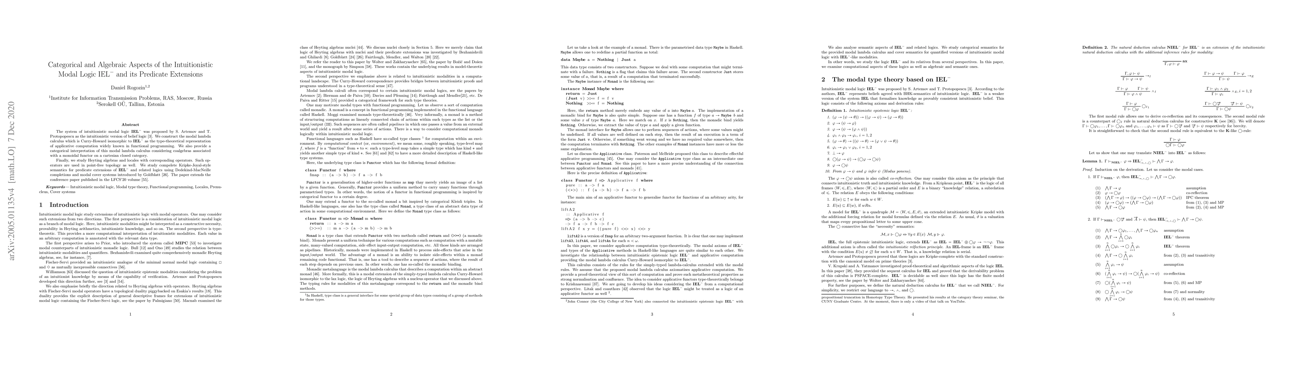 The system of intuitionistic modal logic ${\bf IEL}^{-}$ was proposed by S. Artemov and T. Protopopescu as the intuitionistic version of belief logic \cite{Artemov}. We construct the modal lambda calculus which is Curry-Howard isomorphic to ${\bf IEL}^{-}$ as the type-theoretical representation of applicative computation widely known in functional programming. We also provide a categorical interpretation of this modal lambda calculus considering coalgebras associated with a monoidal functor on a cartesian closed category. Finally, we study Heyting algebras and locales with corresponding operators. Such operators are used in point-free topology as well. We study compelete Kripke-Joyal-style semantics for predicate extensions of ${\bf IEL}^{-}$ and related logics using Dedekind-MacNeille completions and modal cover systems introduced by Goldblatt \cite{goldblatt2011cover}. The paper extends the conference paper published in the LFCS'20 volume \cite{rogozin2020modal}.