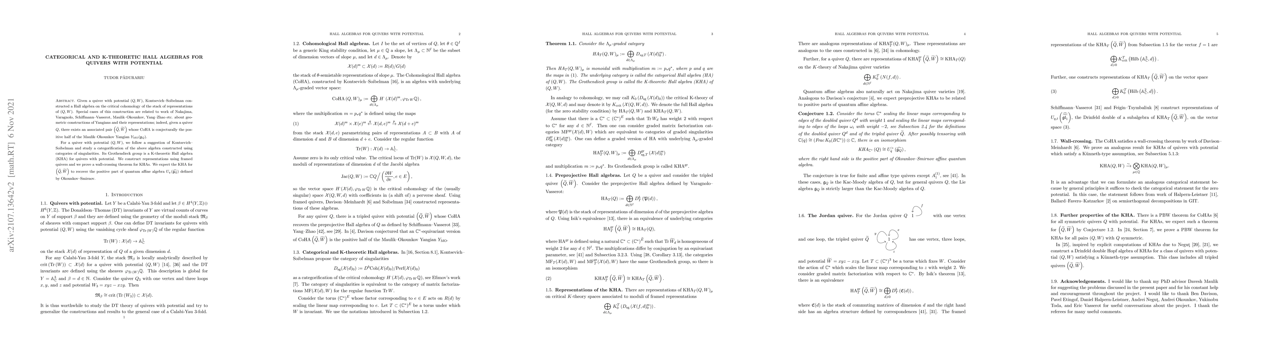 This paper constructs K-theoretic Hall algebras (KHAs) for quivers with potential using categories of singularities, proving a wall-crossing theorem. It suggests that the KHA for a related pair $(\widetilde{Q},\widetilde{W})$ may recover the positive part of the quantum affine algebra $U_q(\widehat{\mathfrak{g}_Q})$.