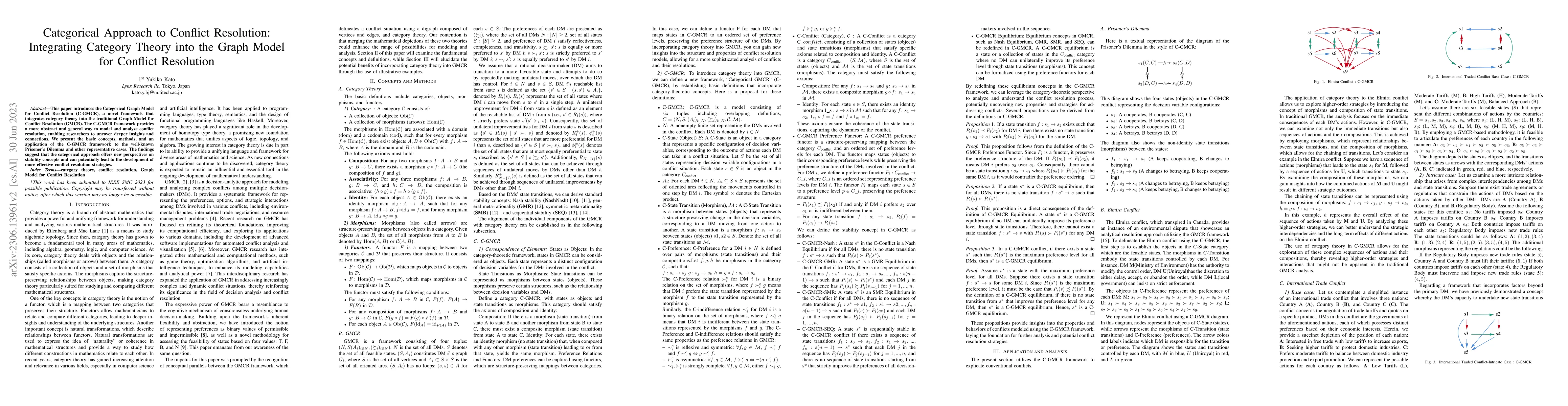 This paper introduces the Categorical Graph Model for Conflict Resolution (C-GMCR), a novel framework that integrates category theory into the traditional Graph Model for Conflict Resolution (GMCR). The C-GMCR framework provides a more abstract and general way to model and analyze conflict resolution, enabling researchers to uncover deeper insights and connections. We present the basic concepts, methods, and application of the C-GMCR framework to the well-known Prisoner's Dilemma and other representative cases. The findings suggest that the categorical approach offers new perspectives on stability concepts and can potentially lead to the development of more effective conflict resolution strategies.