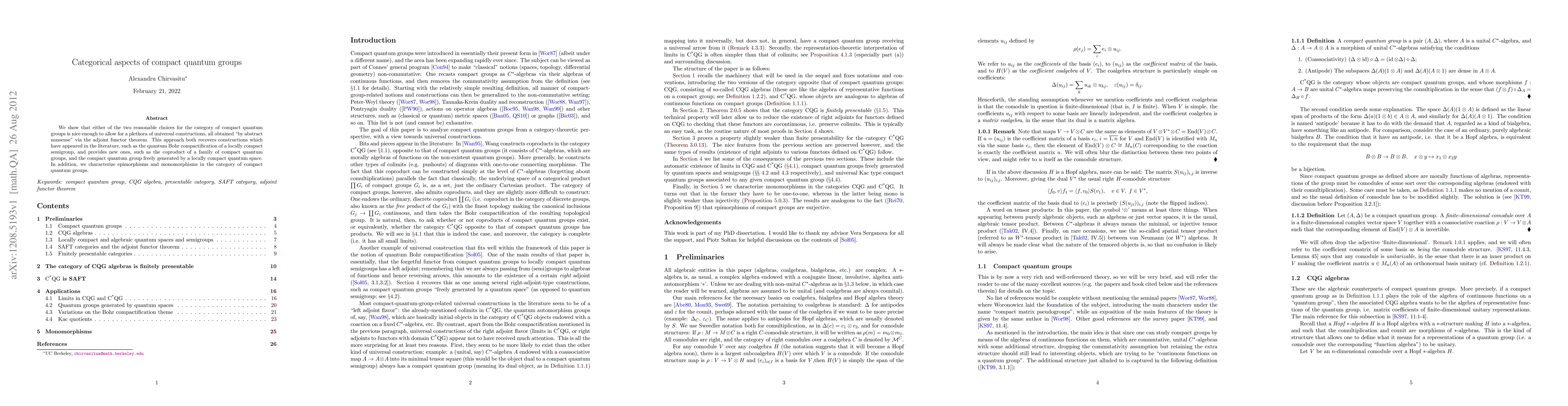 This paper demonstrates that two proposed categories for compact quantum groups are suitable for numerous universal construction methods, achieved through abstract non-concrete 'adjoint functor theorem' techniques. These methods recover existing constructions like quantum Bohr compactification, and introduce new ones such as quantum group coproducts and those generated by quantum spaces. The paper also identifies epimorphisms and monomorphisms within the compact quantum group category.