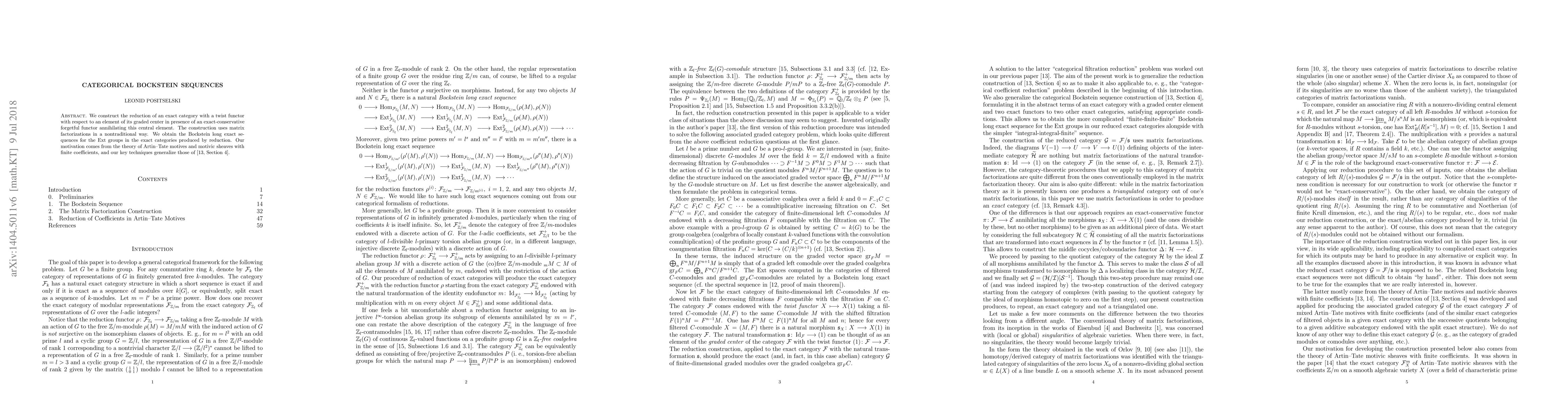 We construct the reduction of an exact category with a twist functor with respect to an element of its graded center in presence of an exact-conservative forgetful functor annihilating this central element. The procedure allows, e.g., to recover the abelian/exact category of modular representations of a finite group from the exact category of its l-adic representations. The construction uses matrix factorizations in a nontraditional way. We obtain the Bockstein long exact sequences for the Ext groups in the exact categories produced by reduction. Our motivation comes from the theory of Artin-Tate motives and motivic sheaves with finite coefficients, and our key techniques generalize those of Section 4 in arXiv:1006.4343