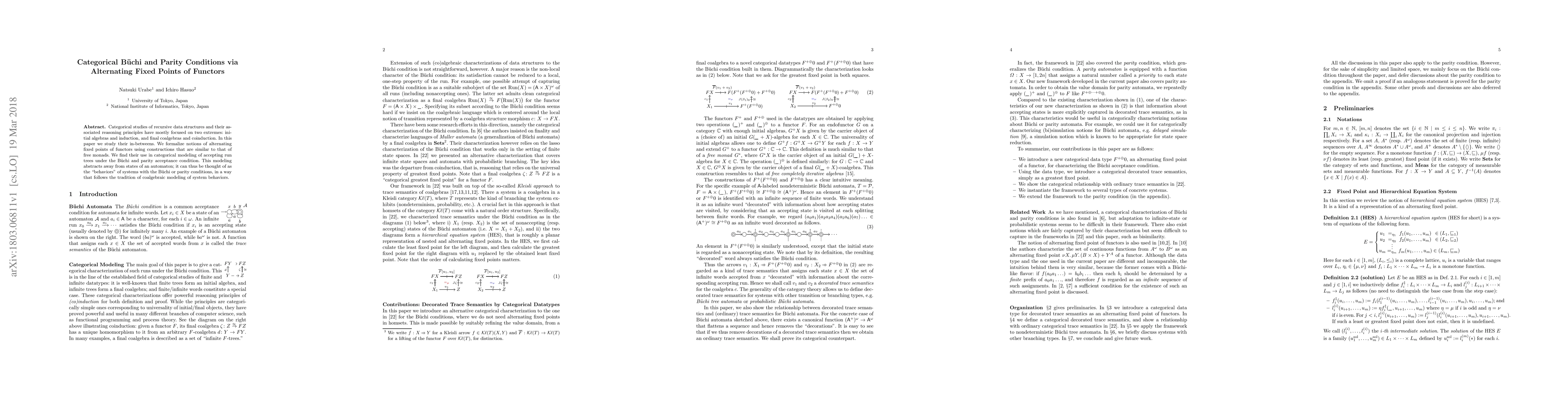 This paper introduces alternating fixed points of functors to model Buechi and parity acceptance conditions in categorical coalgebraic systems, abstracting from automaton states to focus on system behaviors. This approach bridges traditional initial and final algebra-based reasoning principles.