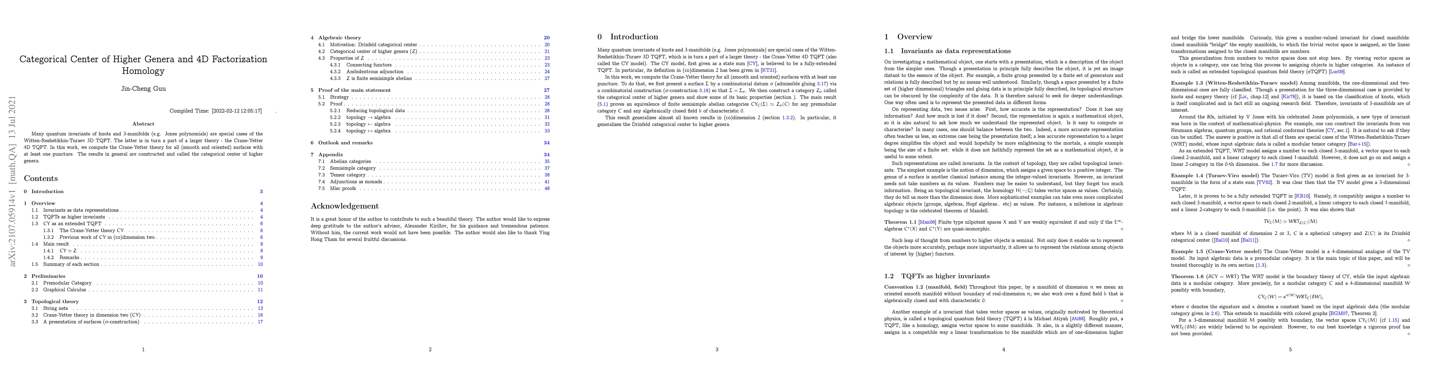 This research computes the Crane-Yetter 4D TQFT for all surfaces with punctures, introducing the concept of the categorical center of higher genera, which encompasses quantum invariants like Jones polynomials.