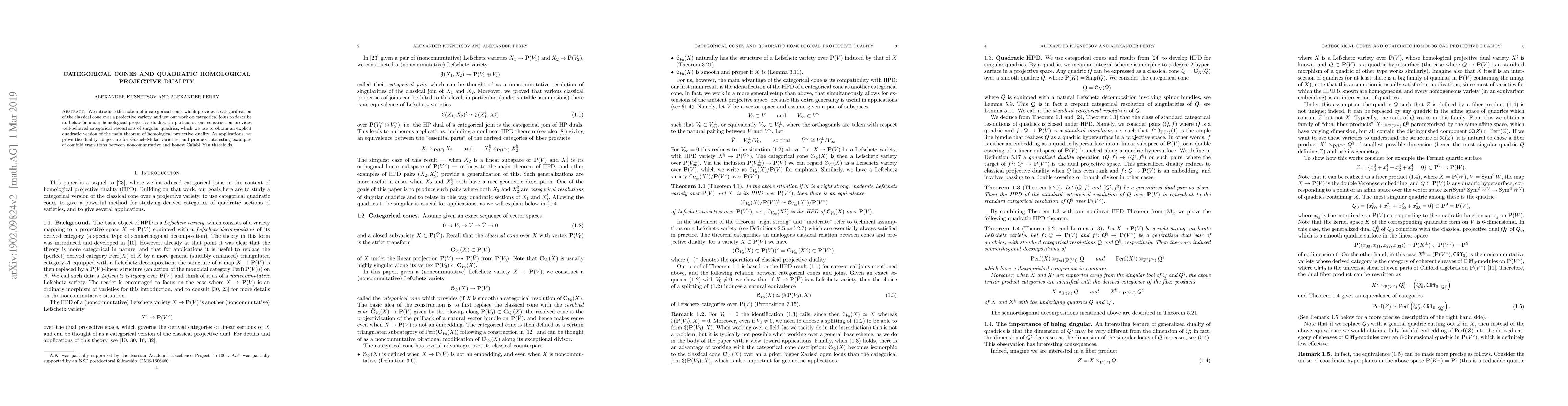 We introduce the notion of a categorical cone, which provides a categorification of the classical cone over a projective variety, and use our work on categorical joins to describe its behavior under homological projective duality. In particular, our construction provides well-behaved categorical resolutions of singular quadrics, which we use to obtain an explicit quadratic version of the main theorem of homological projective duality. As applications, we prove the duality conjecture for Gushel-Mukai varieties, and produce interesting examples of conifold transitions between noncommutative and honest Calabi-Yau threefolds.