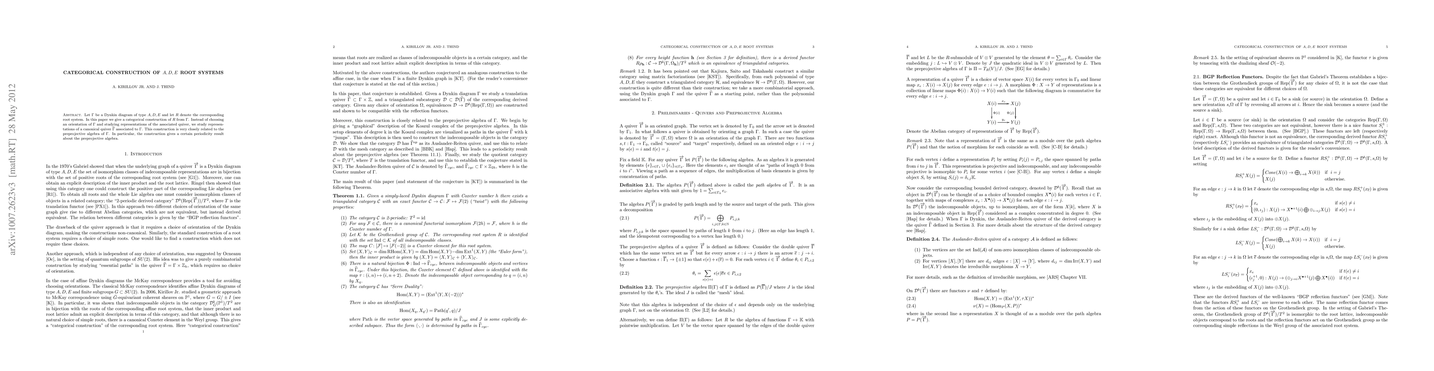 This paper presents a categorical construction of root systems A, D, and E from their corresponding Dynkin diagrams, using representations of a canonical quiver \(\Gammahat\) instead of an oriented Dynkin diagram, leading to a periodicity result about the preprojective algebra.