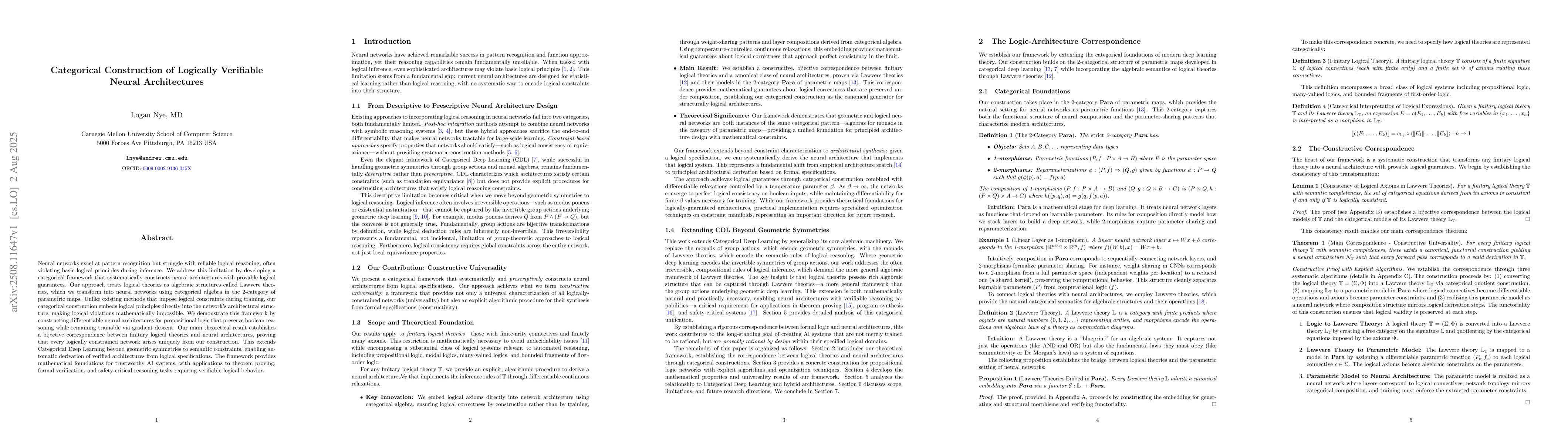 Neural networks excel at pattern recognition but struggle with reliable logical reasoning, often violating basic logical principles during inference. We address this limitation by developing a categorical framework that systematically constructs neural architectures with provable logical guarantees. Our approach treats logical theories as algebraic structures called Lawvere theories, which we transform into neural networks using categorical algebra in the 2-category of parametric maps. Unlike existing methods that impose logical constraints during training, our categorical construction embeds logical principles directly into the network's architectural structure, making logical violations mathematically impossible. We demonstrate this framework by constructing differentiable neural architectures for propositional logic that preserve boolean reasoning while remaining trainable via gradient descent. Our main theoretical result establishes a bijective correspondence between finitary logical theories and neural architectures, proving that every logically constrained network arises uniquely from our construction. This extends Categorical Deep Learning beyond geometric symmetries to semantic constraints, enabling automatic derivation of verified architectures from logical specifications. The framework provides mathematical foundations for trustworthy AI systems, with applications to theorem proving, formal verification, and safety-critical reasoning tasks requiring verifiable logical behavior.