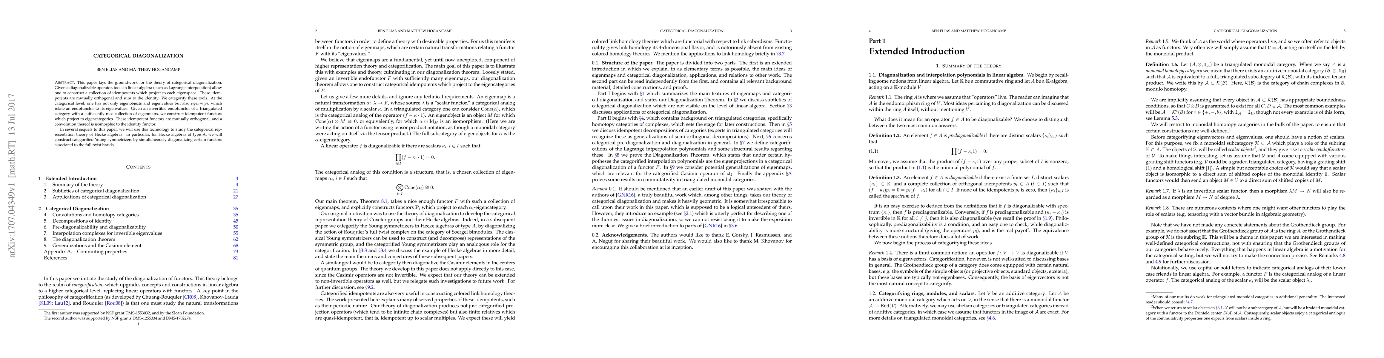 This paper lays the groundwork for the theory of categorical diagonalization. Given a diagonalizable operator, tools in linear algebra (such as Lagrange interpolation) allow one to construct a collection of idempotents which project to each eigenspace. These idempotents are mutually orthogonal and sum to the identity. We categorify these tools. At the categorical level, one has not only eigenobjects and eigenvalues but also eigenmaps, which relate an endofunctor to its eigenvalues. Given an invertible endofunctor of a triangulated category with a sufficiently nice collection of eigenmaps, we construct idempotent functors which project to eigencategories. These idempotent functors are mutually orthogonal, and a convolution thereof is isomorphic to the identity functor. In several sequels to this paper, we will use this technology to study the categorical representation theory of Hecke algebras. In particular, for Hecke algebras of type A, we will construct categorified Young symmetrizers by simultaneously diagonalizing certain functors associated to the full twist braids.