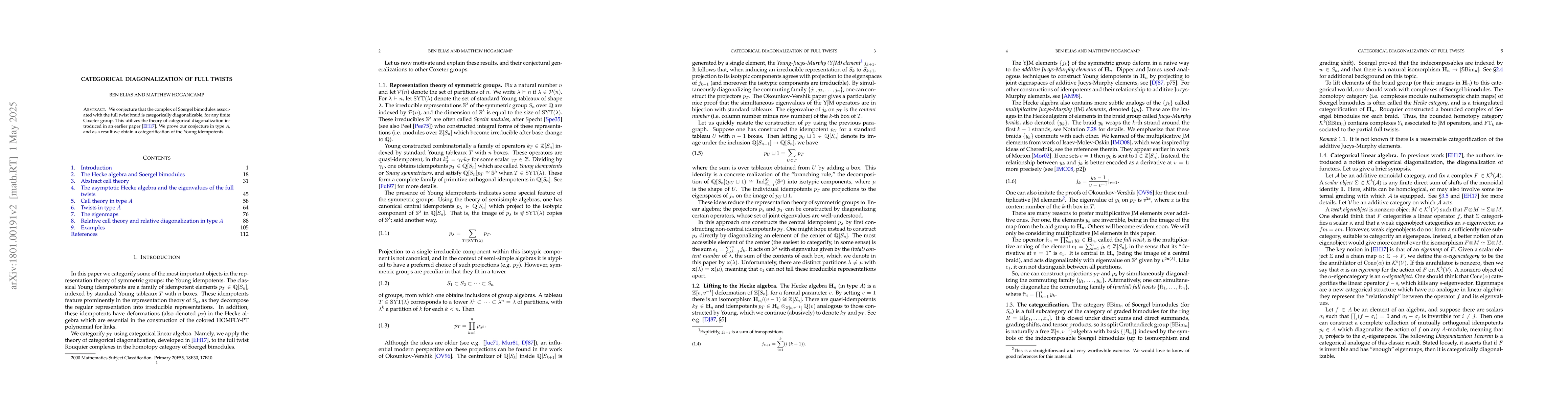 Researchers prove a conjecture on categorical diagonalization of full twist braids in type A Coxeter groups, leading to a categorification of Young idempotents.