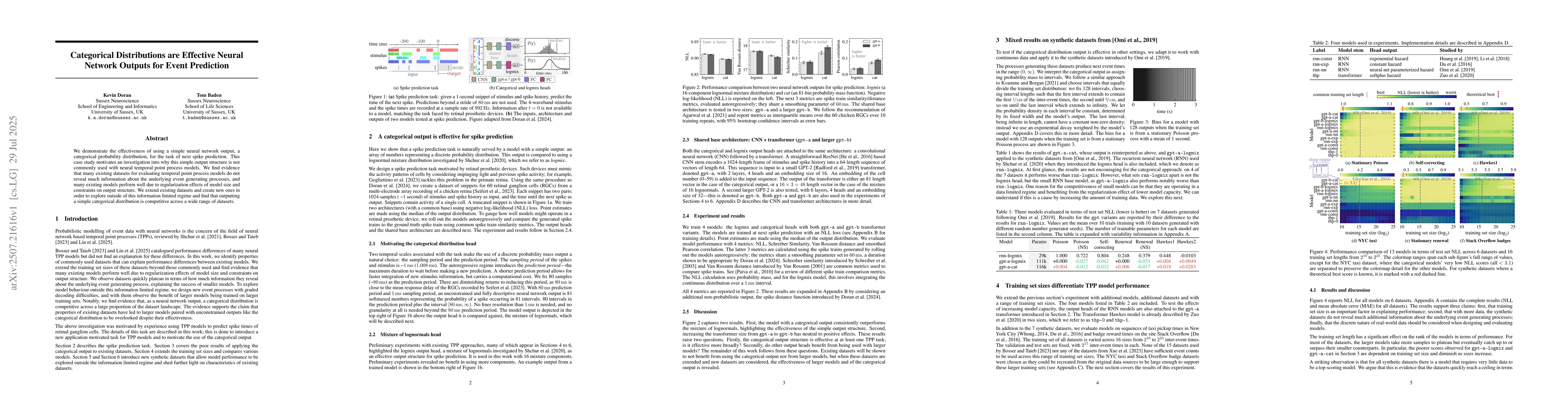 We demonstrate the effectiveness of using a simple neural network output, a categorical probability distribution, for the task of next spike prediction. This case study motivates an investigation into why this simple output structure is not commonly used with neural temporal point process models. We find evidence that many existing datasets for evaluating temporal point process models do not reveal much information about the underlying event generating processes, and many existing models perform well due to regularization effects of model size and constraints on output structure. We extend existing datasets and create new ones in order to explore outside of this information limited regime and find that outputting a simple categorical distribution is competitive across a wide range of datasets.