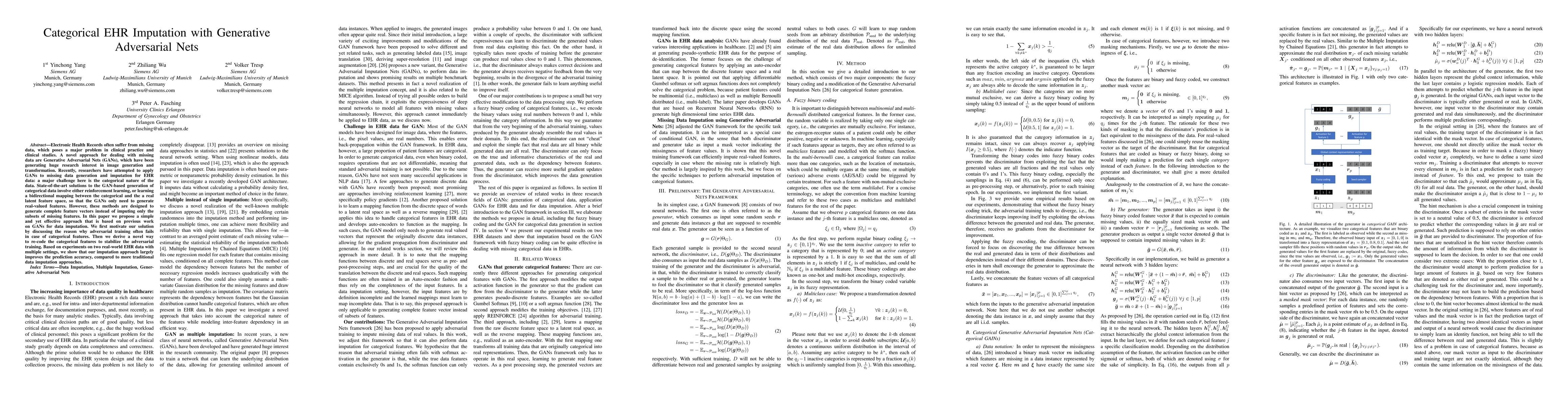 This paper proposes a novel approach for imputing missing categorical data in Electronic Health Records (EHR) using Generative Adversarial Nets (GANs). The authors address the challenge of adversarial training instability for categorical data by re-coding these features, leading to improved prediction accuracy over traditional imputation methods.