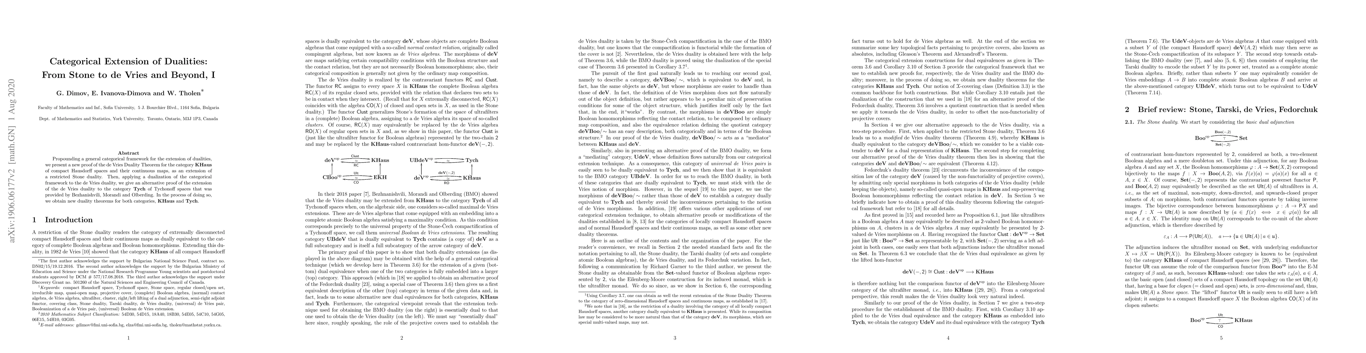 Propounding a general categorical framework for the extension of dualities, we present a new proof of the de Vries Duality Theorem for the category $\bf KHaus$ of compact Hausdorff spaces and their continuous maps, as an extension of a restricted Stone duality. Then, applying a dualization of the categorical framework to the de Vries duality, we give an alternative proof of the extension of the de Vries duality to the category $\bf Tych$ of Tychonoff spaces that was provided by Bezhanishvili, Morandi and Olberding. In the process of doing so, we obtain new duality theorems for both categories, $\bf{KHaus}$ and $\bf Tych$.