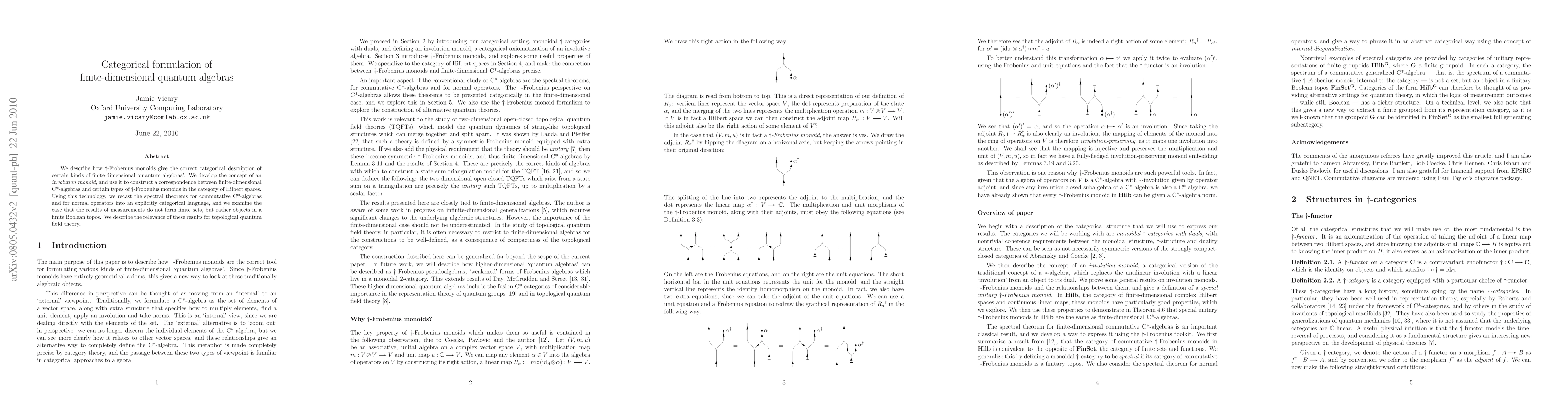 The paper formulates quantum algebras categorically using dagger-Frobenius monoids, establishing a correspondence between finite-dimensional C*-algebras and specific types of dagger-Frobenius monoids in the category of Hilbert spaces.