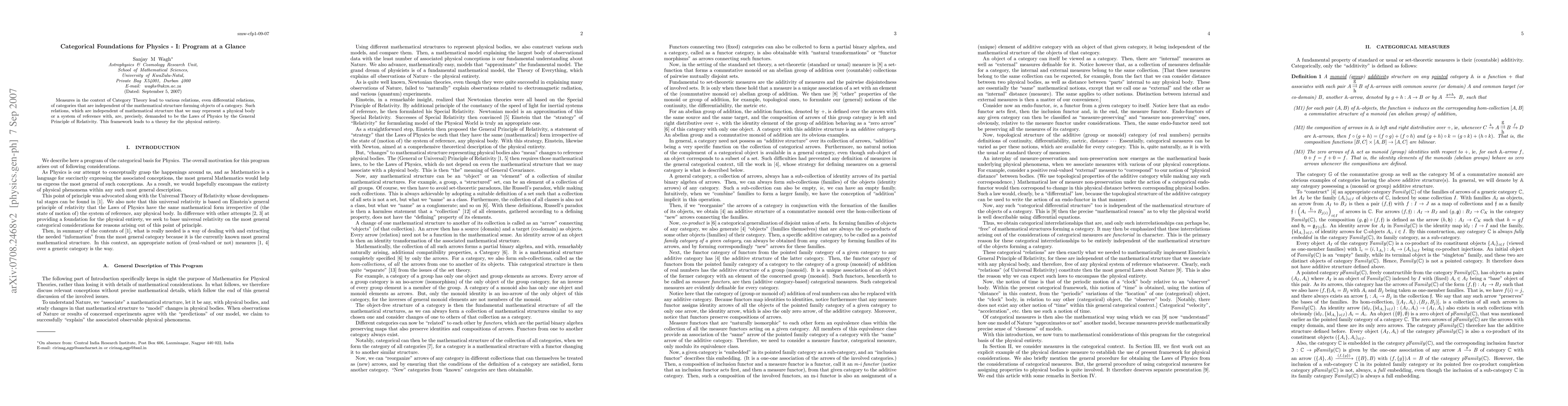 Measures in the context of Category Theory lead to various relations, even differential relations, of categories that are independent of the mathematical structure forming objects of a category. Such relations, which are independent of mathematical structure that we may represent a physical body or a system of reference with, are, precisely, demanded to be the Laws of Physics by the General Principle of Relativity. This framework leads to a theory for the physical entirety.