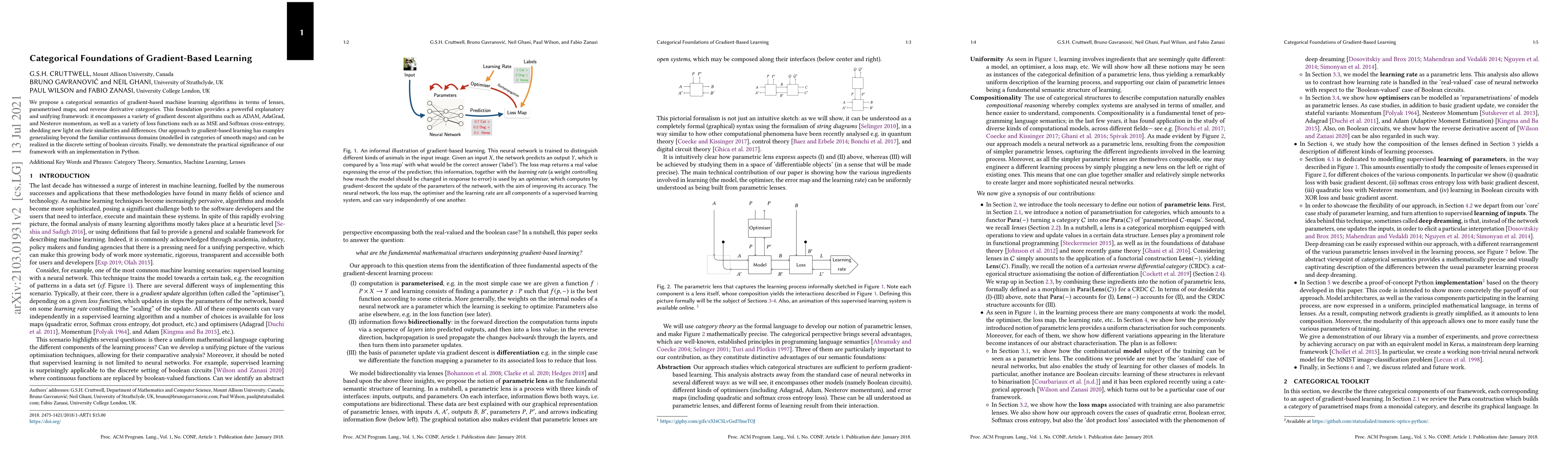 We propose a categorical semantics of gradient-based machine learning algorithms in terms of lenses, parametrised maps, and reverse derivative categories. This foundation provides a powerful explanatory and unifying framework: it encompasses a variety of gradient descent algorithms such as ADAM, AdaGrad, and Nesterov momentum, as well as a variety of loss functions such as as MSE and Softmax cross-entropy, shedding new light on their similarities and differences. Our approach to gradient-based learning has examples generalising beyond the familiar continuous domains (modelled in categories of smooth maps) and can be realized in the discrete setting of boolean circuits. Finally, we demonstrate the practical significance of our framework with an implementation in Python.